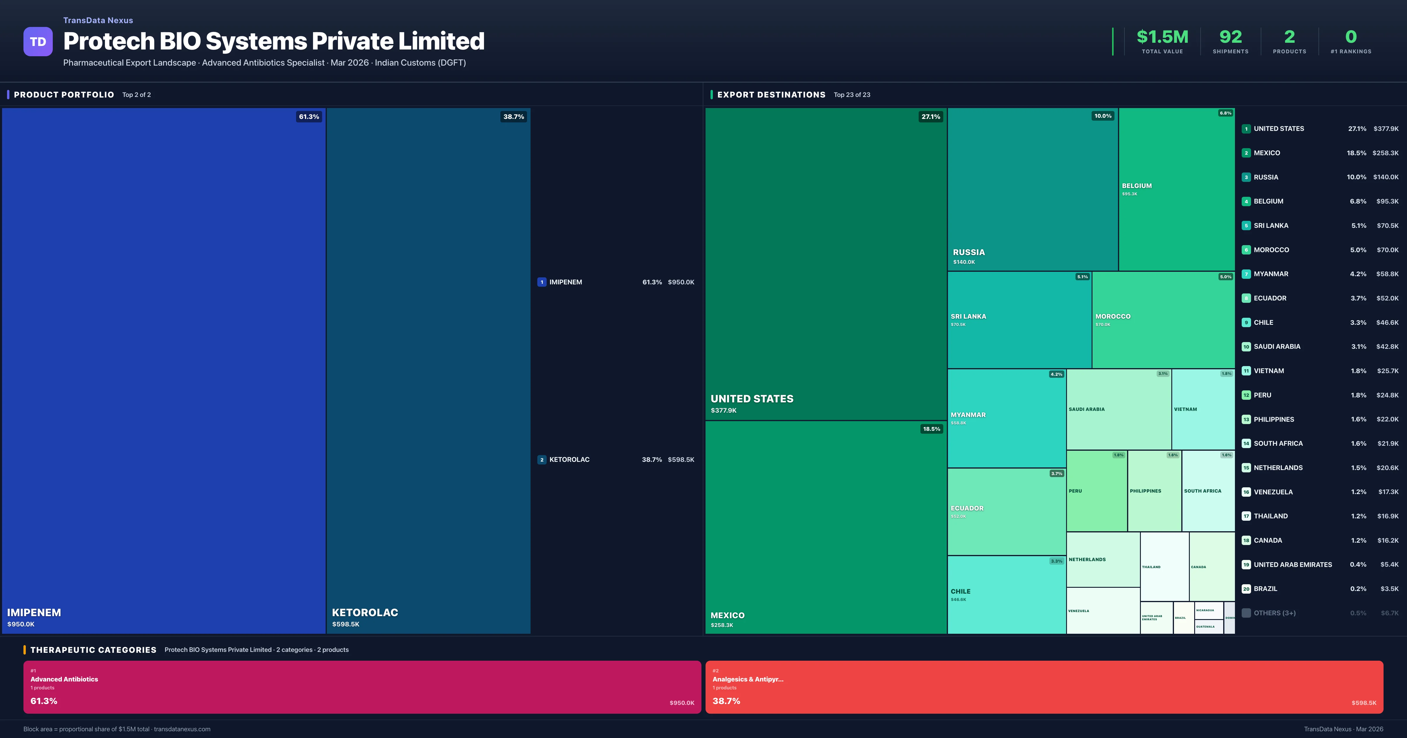 Protech BIO Systems Private Limited is an Indian pharmaceutical exporter with a total trade value of $1.5M across 2 products in 2 therapeutic categories. Based on 92 verified export shipments from Indian Customs (DGFT) records, the company actively competes across multiple product segments. Top exports include Imipenem ($950.0K), Ketorolac ($598.5K), .