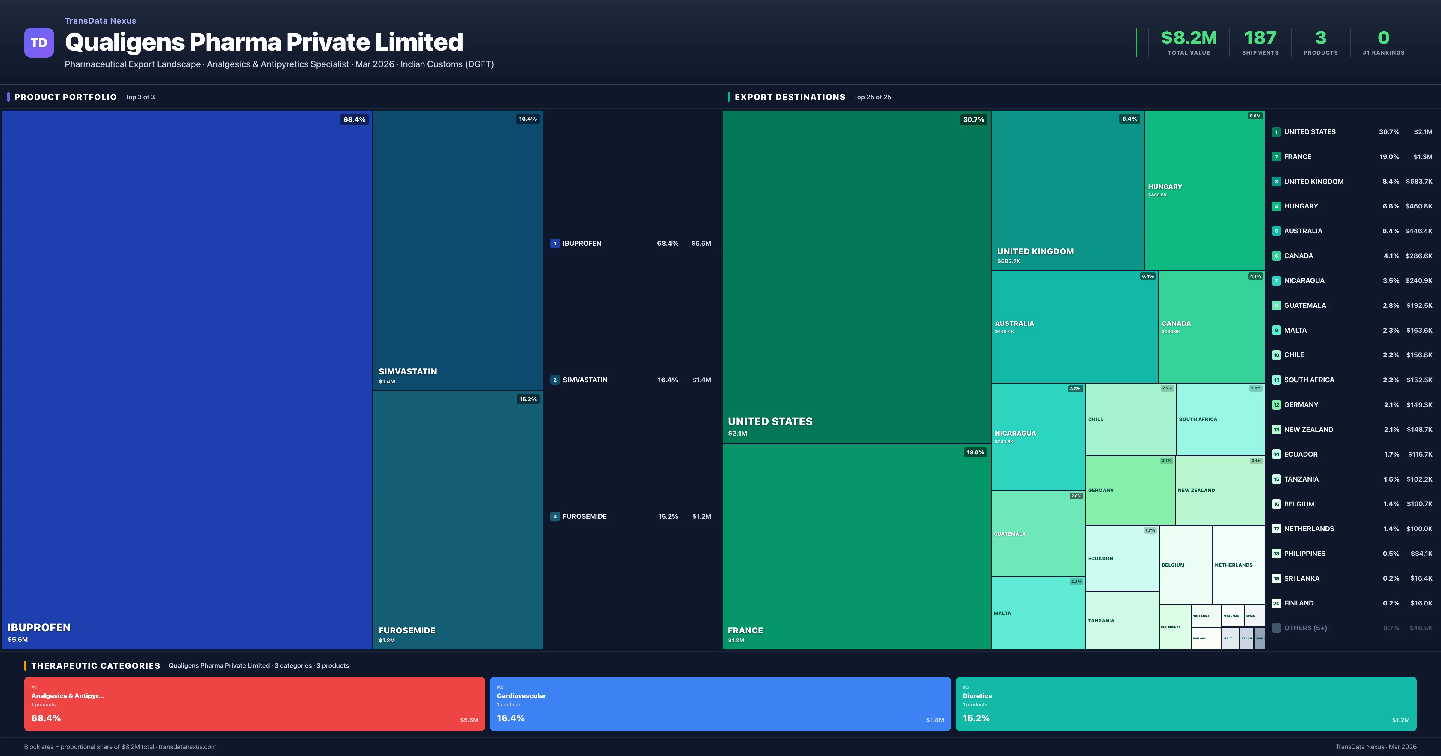 Qualigens Pharma Private Limited's total pharmaceutical export value is $8.2M, based on 187 verified shipments recorded in Indian Customs (DGFT) data.
