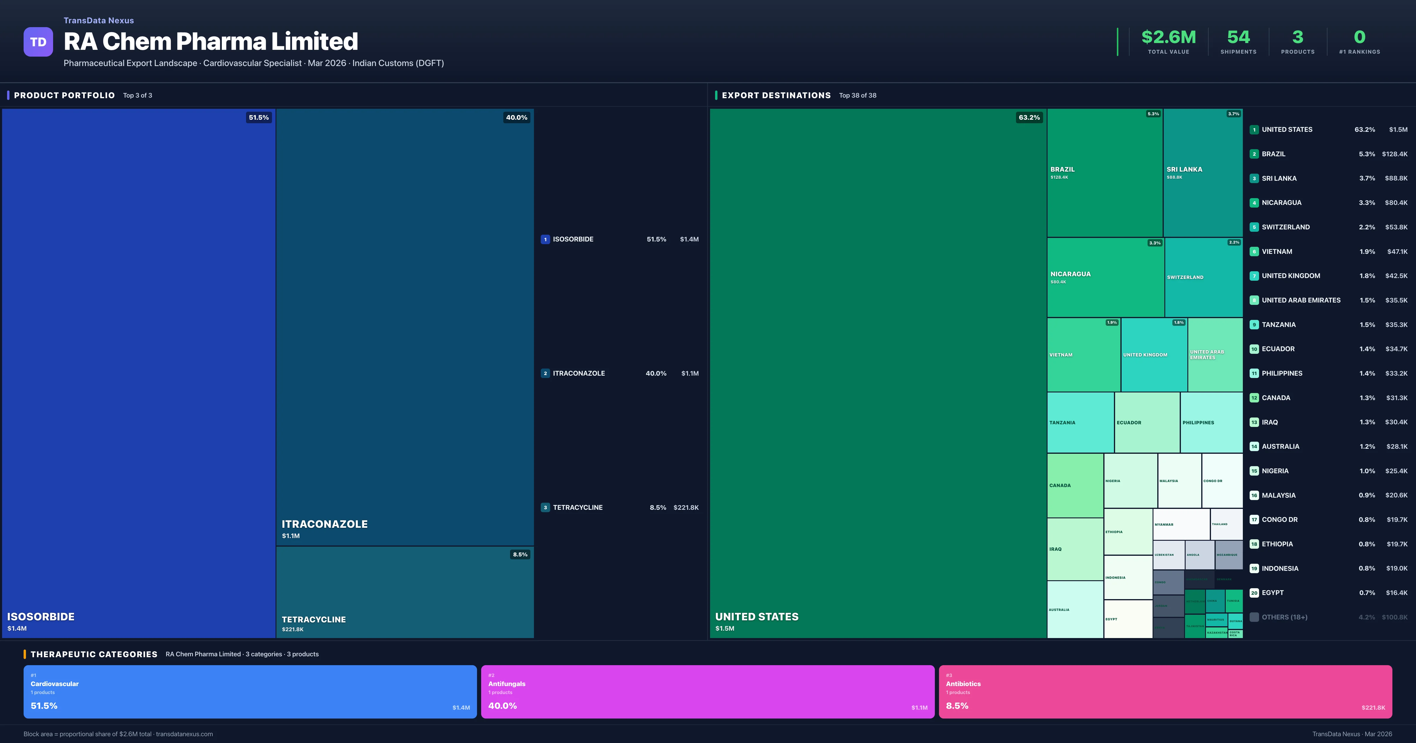 RA Chem Pharma Limited exports 3 pharmaceutical products across 3 therapeutic categories. The top exports are Isosorbide ($1.4M), Itraconazole ($1.1M), Tetracycline ($221.8K). Total export value is $2.6M.
