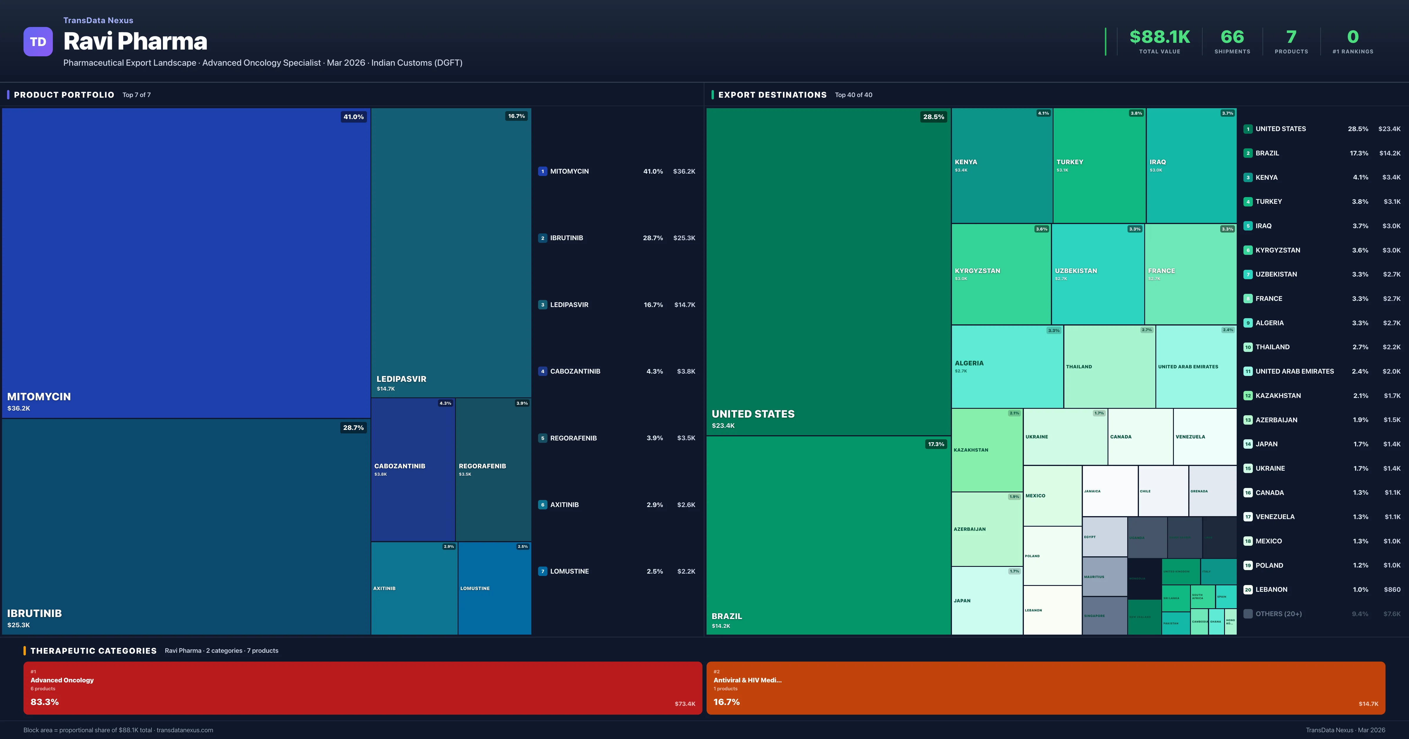 Ravi Pharma is an Indian pharmaceutical exporter with a total trade value of $88.1K across 7 products in 2 therapeutic categories. Based on 66 verified export shipments from Indian Customs (DGFT) records, the company actively competes across multiple product segments. Top exports include Mitomycin ($36.2K), Ibrutinib ($25.3K), Ledipasvir ($14.7K).