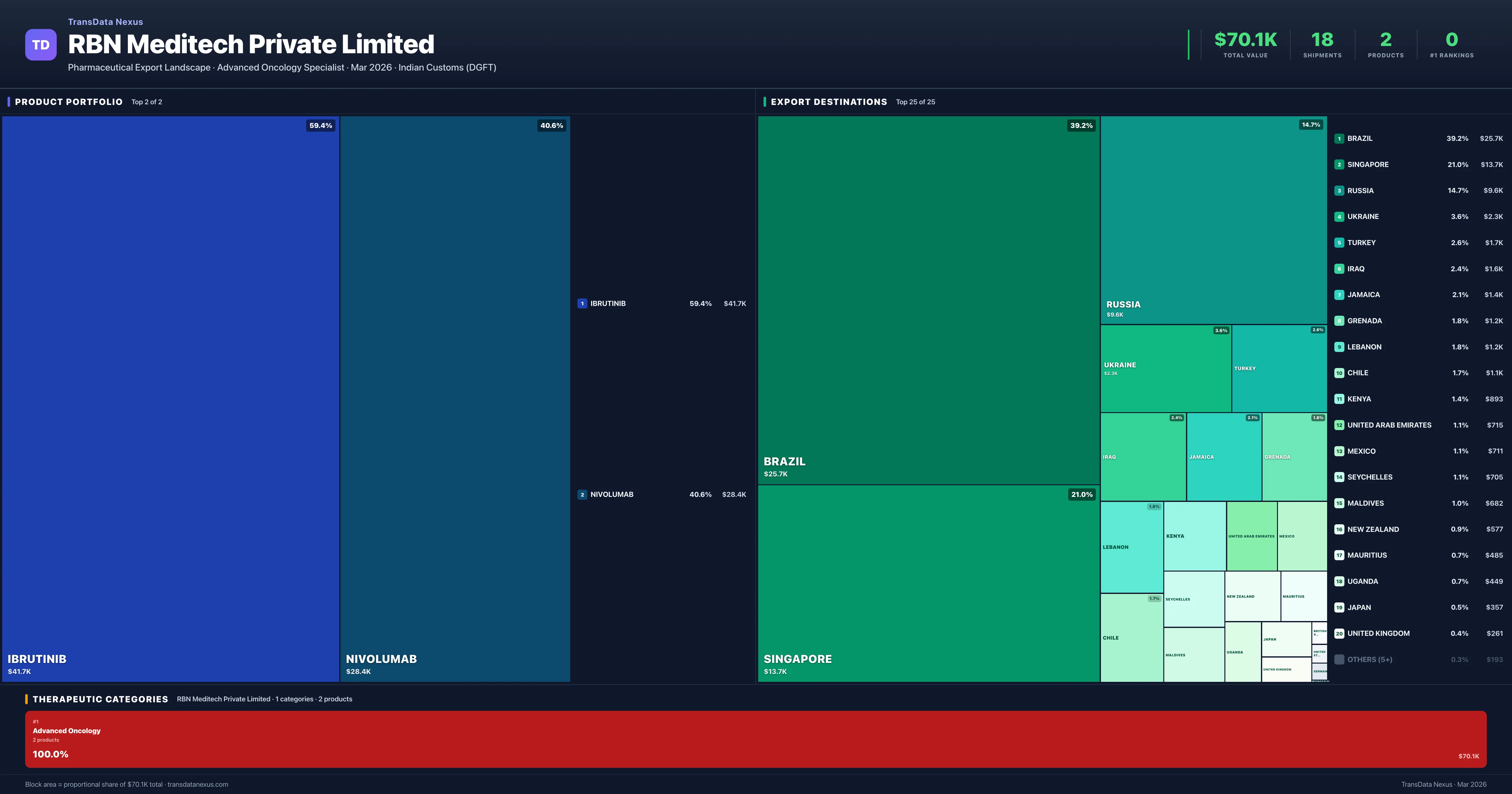 RBN Meditech Private Limited is an Indian pharmaceutical exporter with a total trade value of $70.1K across 2 products in 1 therapeutic categories. Based on 18 verified export shipments from Indian Customs (DGFT) records, the company actively competes across multiple product segments. Top exports include Ibrutinib ($41.7K), Nivolumab ($28.4K), .