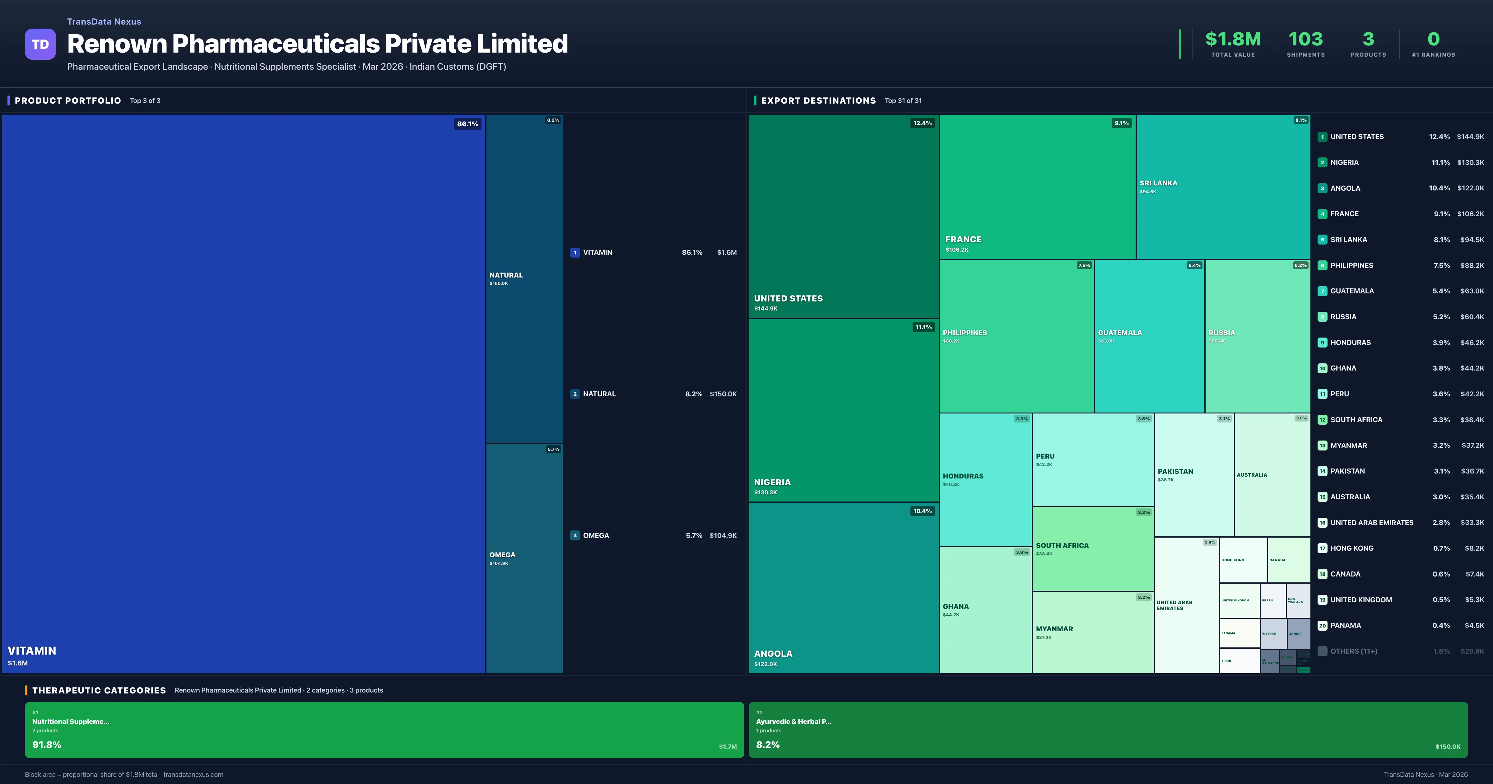 Renown Pharmaceuticals Private Limited exports 3 pharmaceutical products across 2 therapeutic categories. The top exports are Vitamin ($1.6M), Natural ($150.0K), Omega ($104.9K). Total export value is $1.8M.
