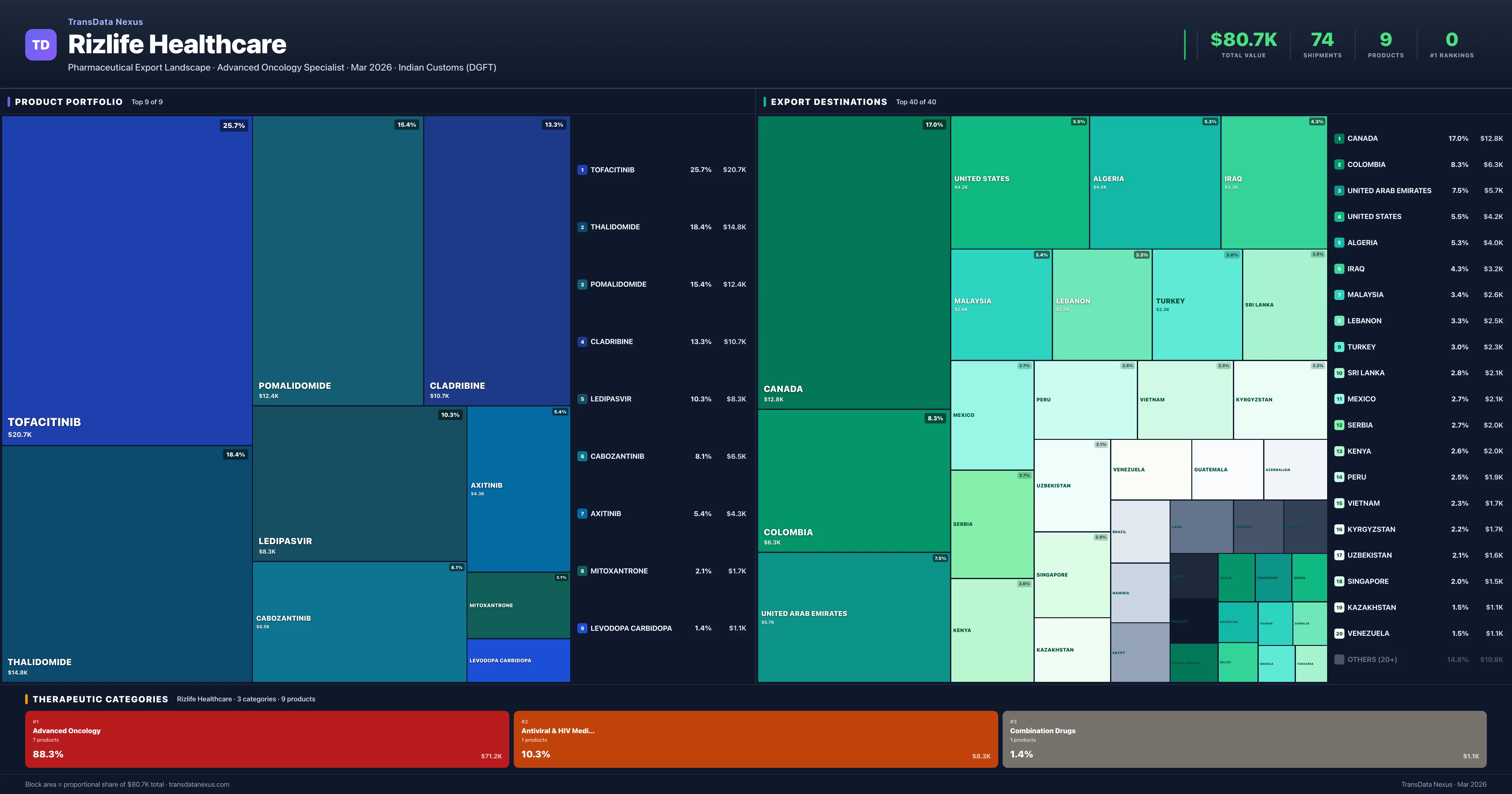 Rizlife Healthcare exports 9 pharmaceutical products across 3 therapeutic categories. The top exports are Tofacitinib ($20.7K), Thalidomide ($14.8K), Pomalidomide ($12.4K), Cladribine ($10.7K), Ledipasvir ($8.3K). Total export value is $80.7K.