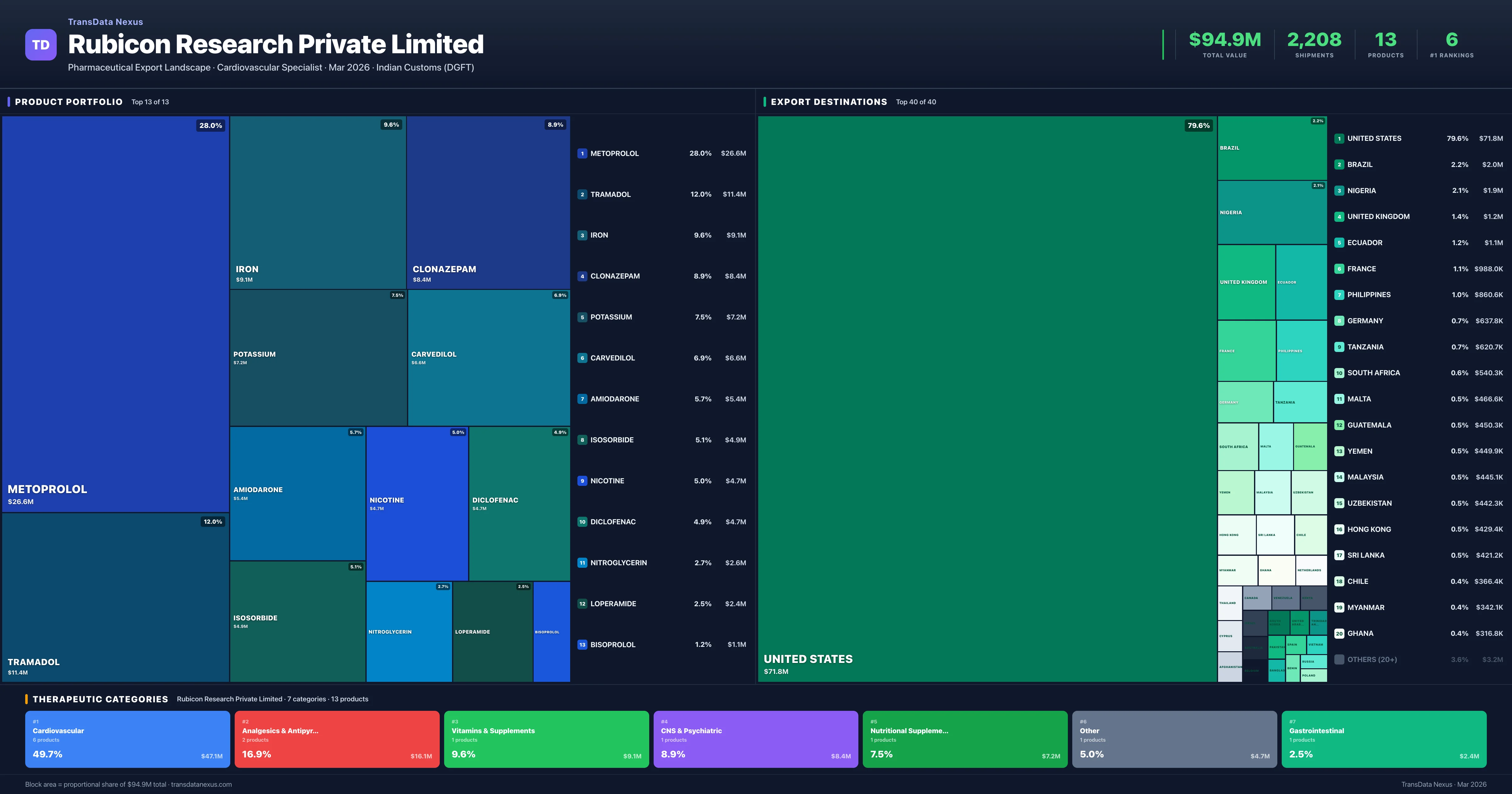 Rubicon Research Private Limited is an Indian pharmaceutical exporter with a total trade value of $94.9M across 13 products in 7 therapeutic categories. Based on 2,208 verified export shipments from Indian Customs (DGFT) records, Rubicon Research Private Limited is the #1 Indian exporter in 6 products including Metoprolol, Tramadol, Clonazepam. Top exports include Metoprolol ($26.6M), Tramadol ($11.4M), Iron ($9.1M).