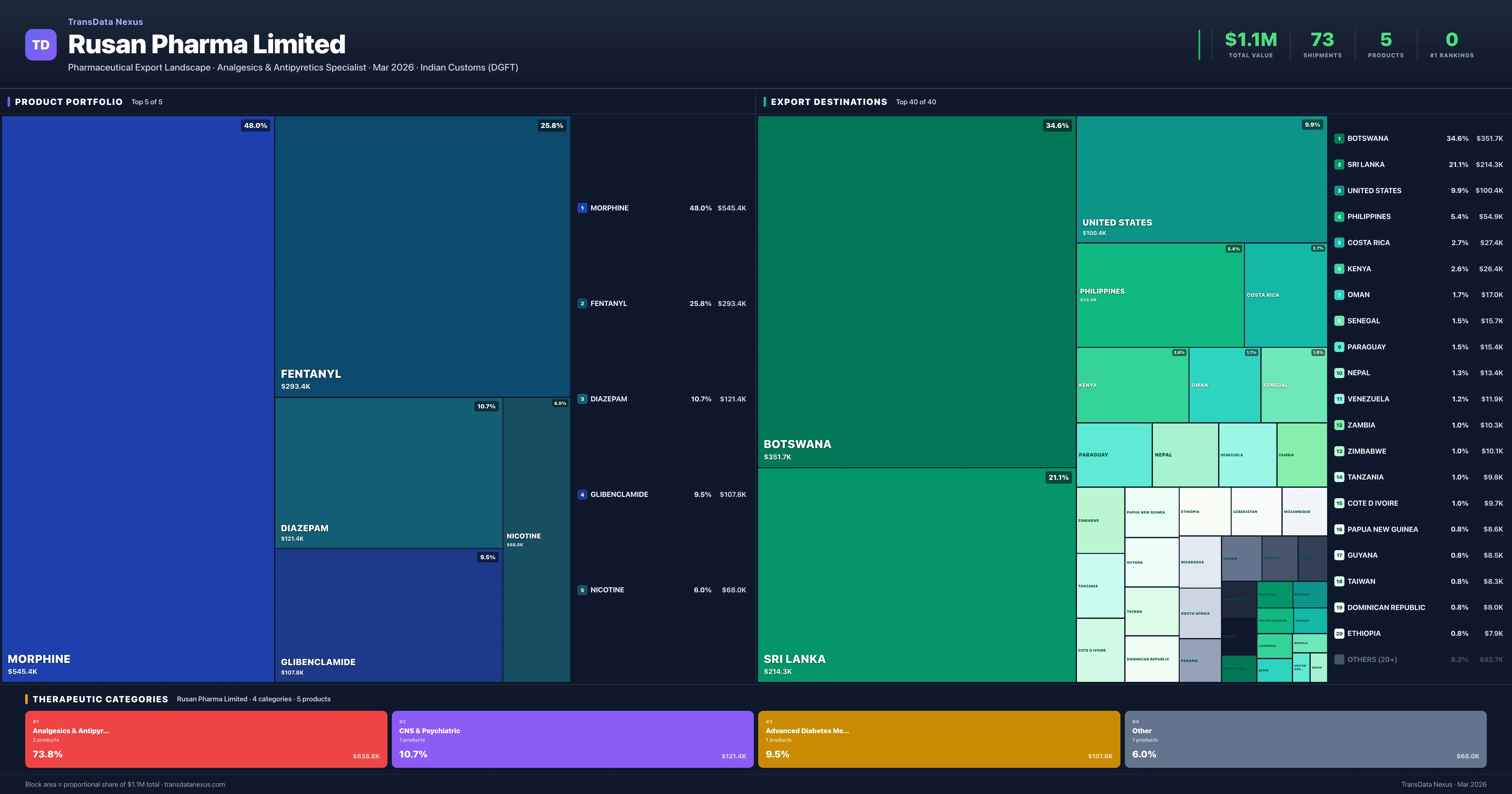 Rusan Pharma Limited's total pharmaceutical export value is $1.1M, based on 73 verified shipments recorded in Indian Customs (DGFT) data.