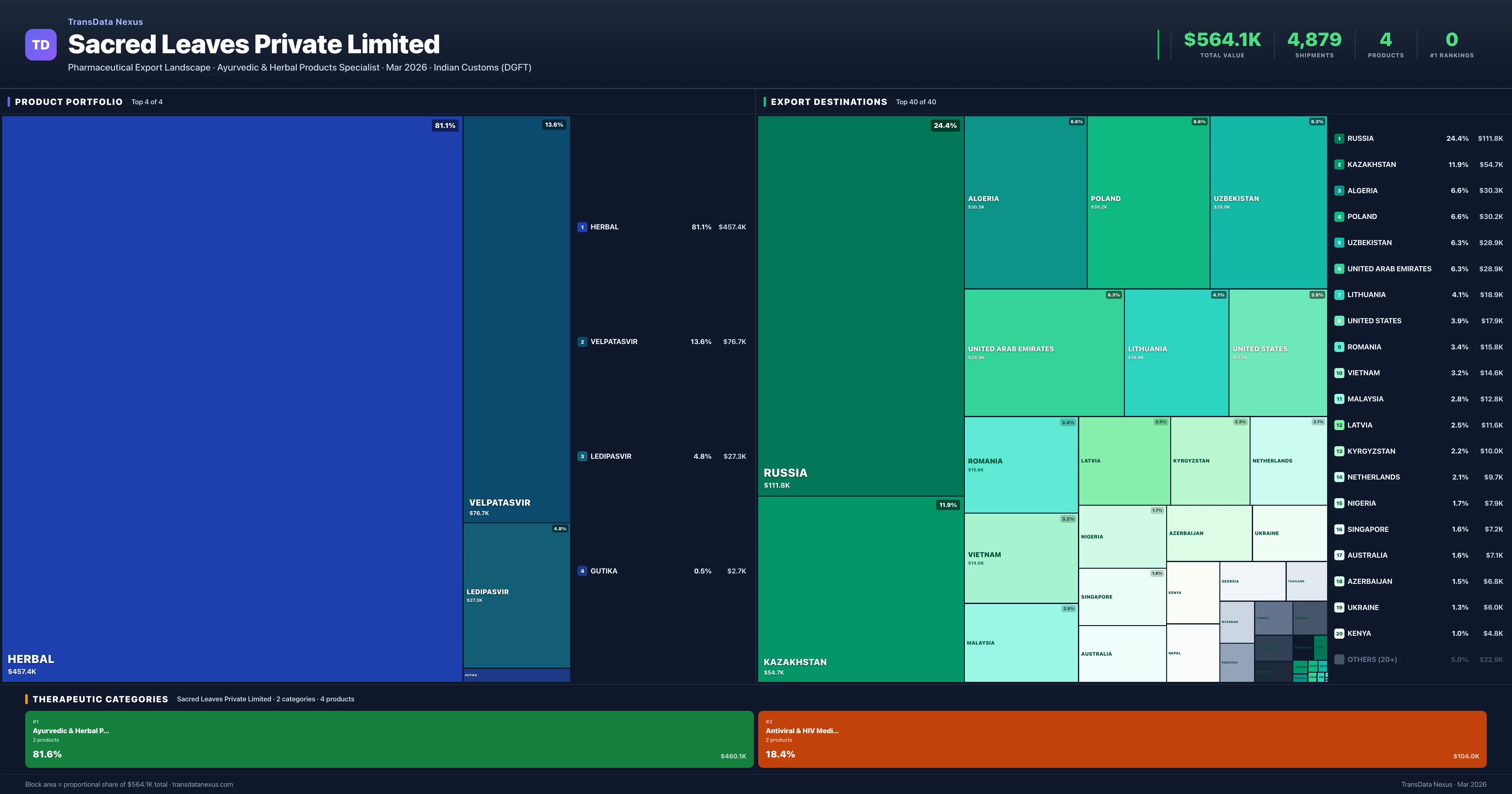 Sacred Leaves Private Limited's total pharmaceutical export value is $564.1K, based on 4,879 verified shipments recorded in Indian Customs (DGFT) data.