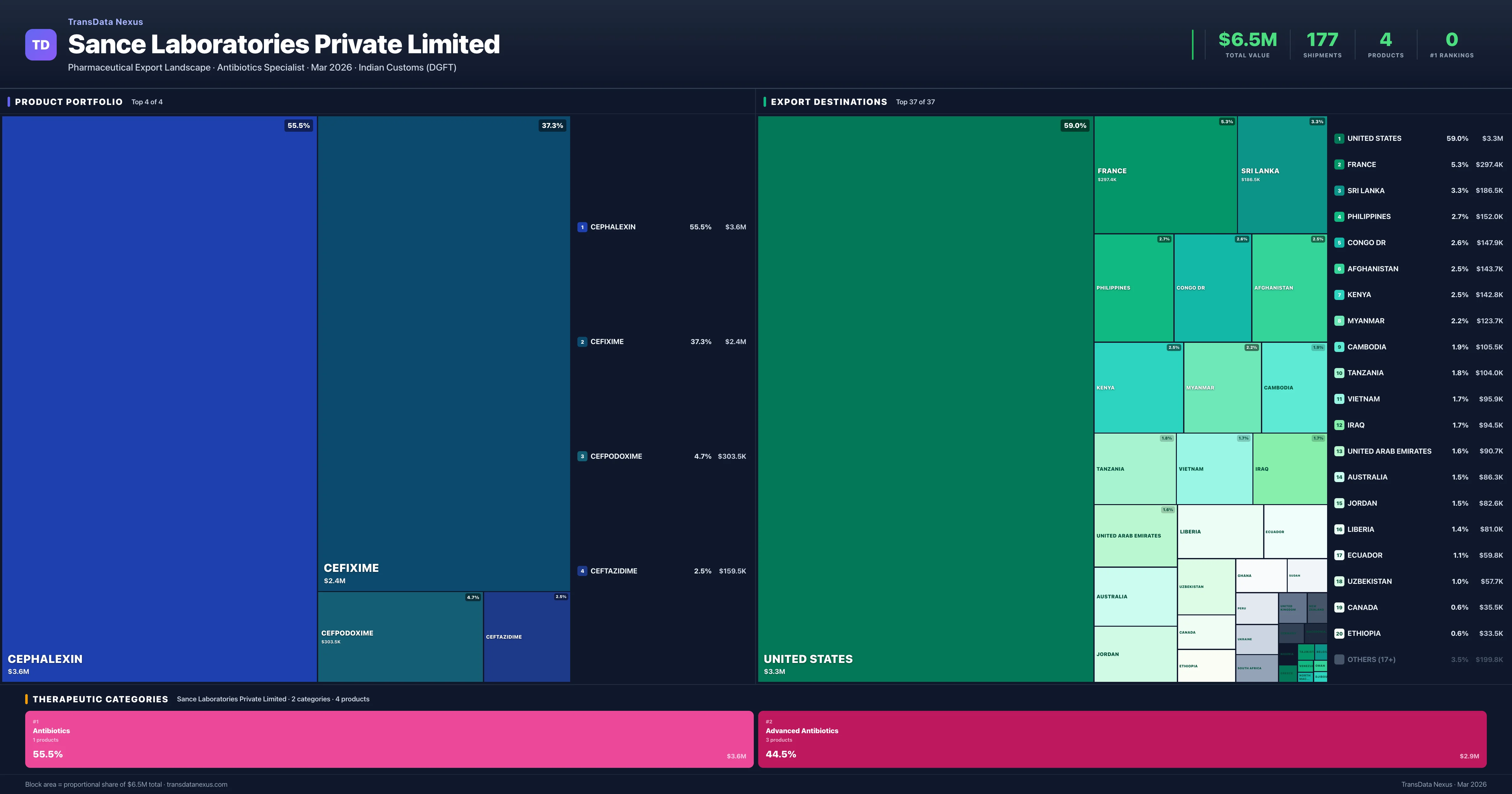 Sance Laboratories Private Limited's total pharmaceutical export value is $6.5M, based on 177 verified shipments recorded in Indian Customs (DGFT) data.