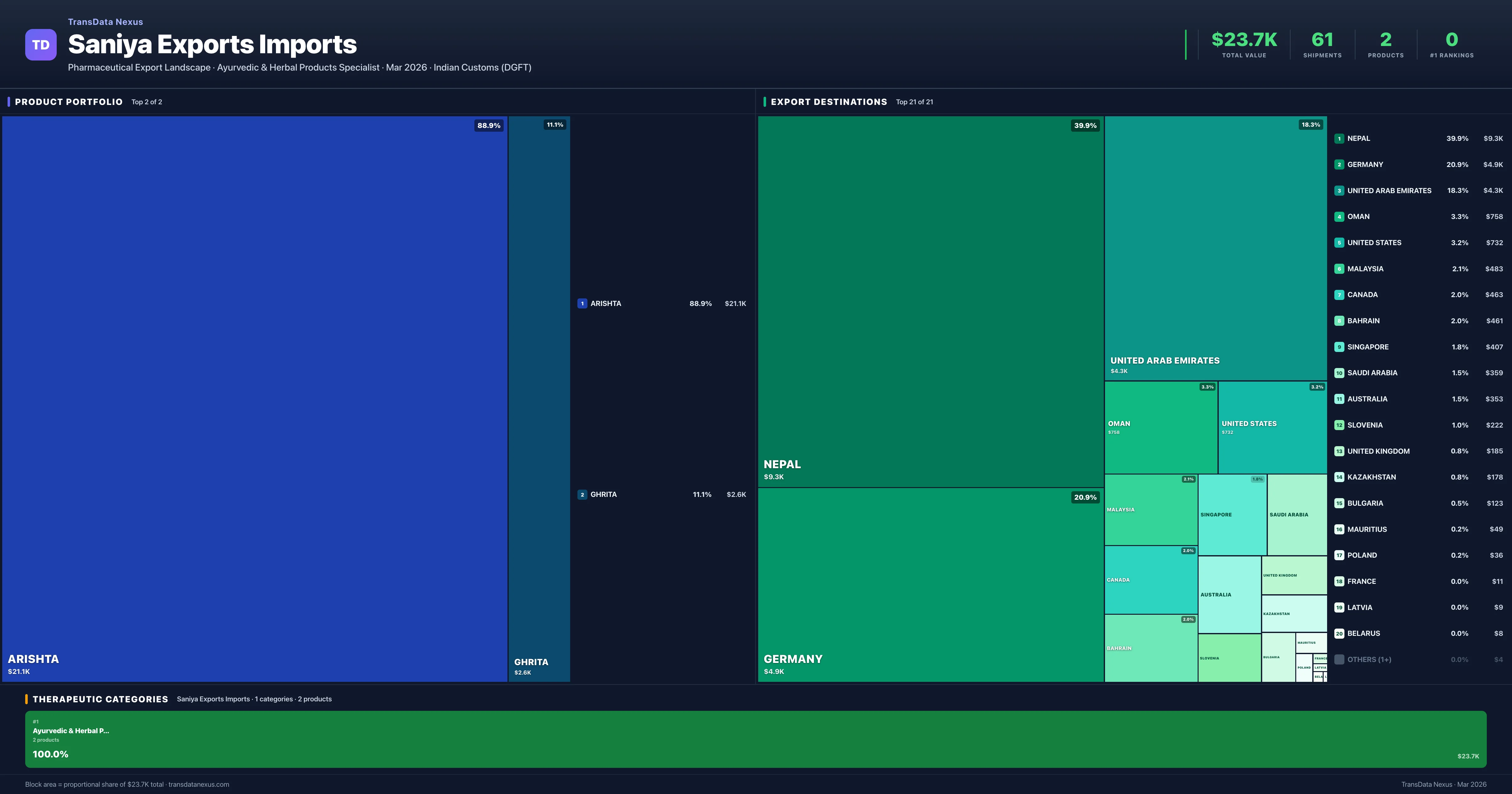 Saniya Exports & Imports operates across 1 therapeutic categories, with Ayurvedic & Herbal Products (100.0%), representing the largest segments by export value. The portfolio is concentrated — the top 5 products account for 100% of total exports.
