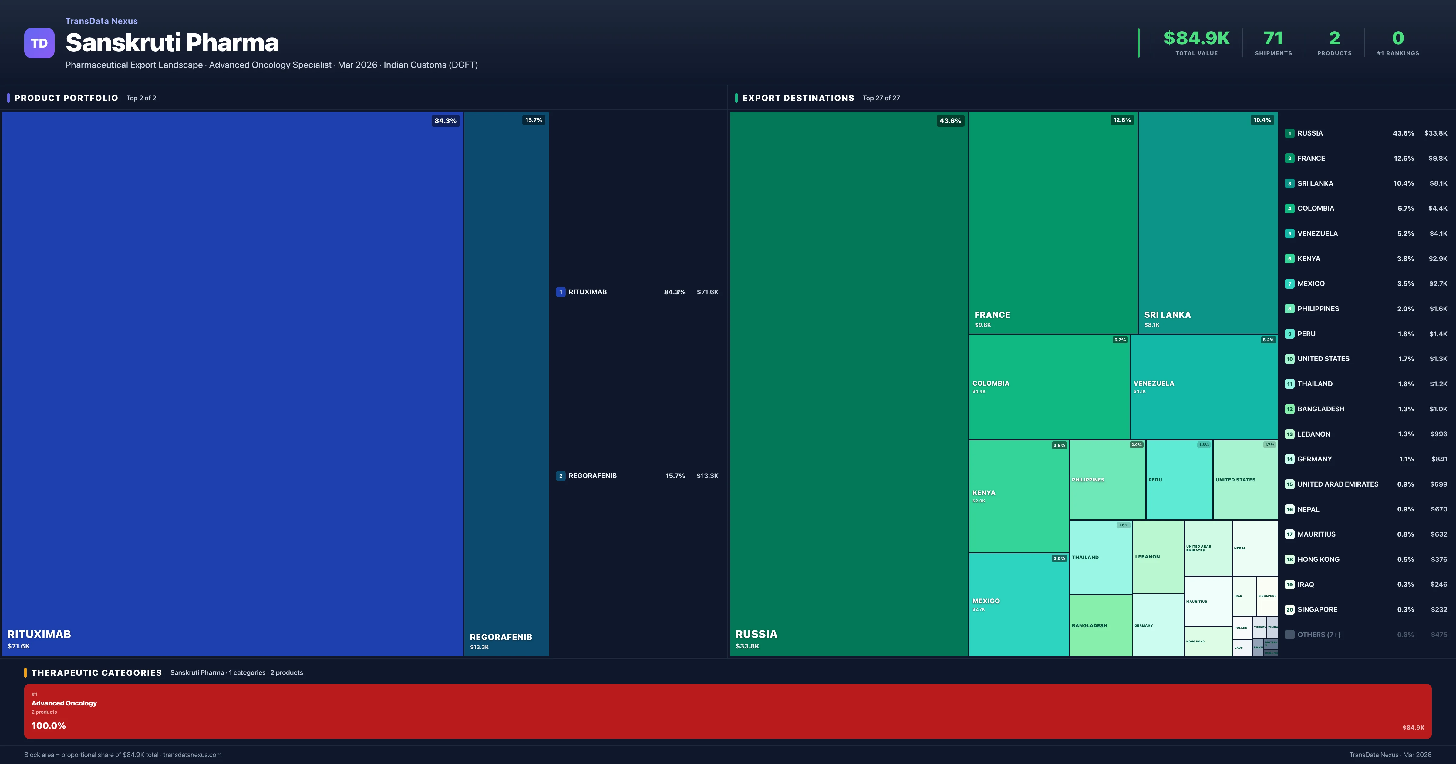 Sanskruti Pharma exports 2 pharmaceutical products across 1 therapeutic categories. The top exports are Rituximab ($71.6K), Regorafenib ($13.3K). Total export value is $84.9K.