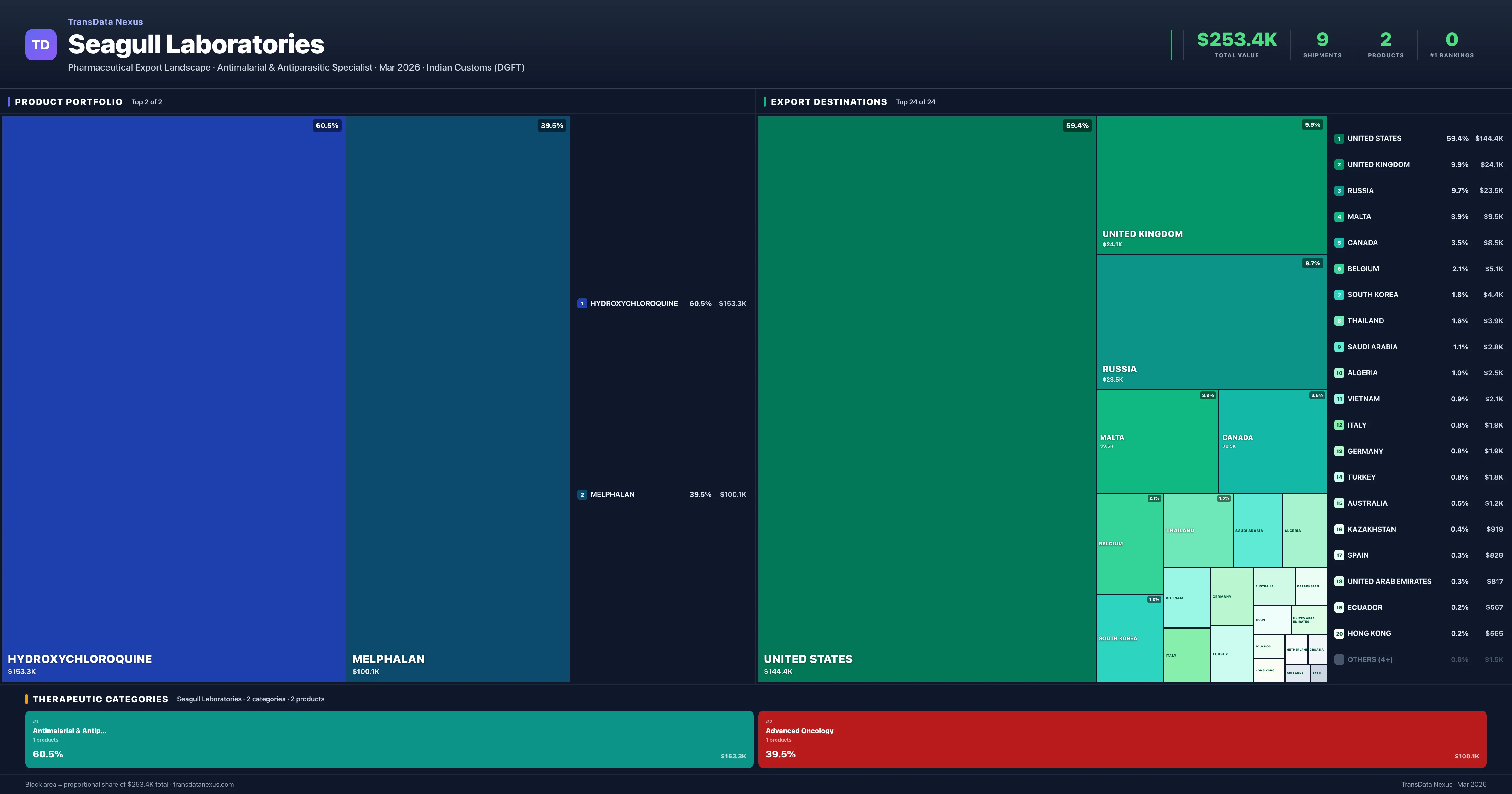 Seagull Laboratories is an Indian pharmaceutical exporter with a total trade value of $253.4K across 2 products in 2 therapeutic categories. Based on 9 verified export shipments from Indian Customs (DGFT) records, the company actively competes across multiple product segments. Top exports include Hydroxychloroquine ($153.3K), Melphalan ($100.1K), .