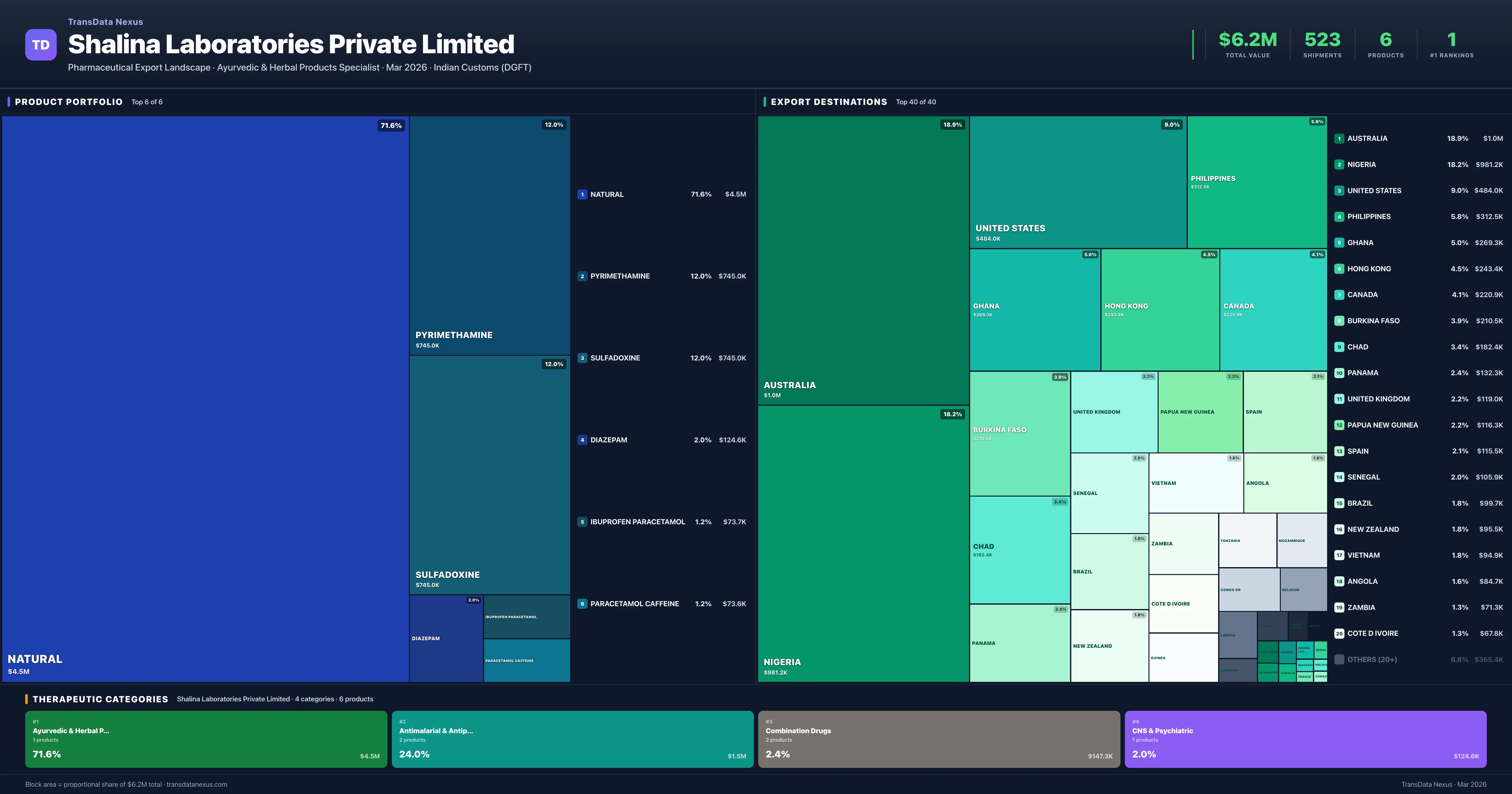 Shalina Laboratories Private Limited is an Indian pharmaceutical exporter with a total trade value of $6.2M across 6 products in 4 therapeutic categories. Based on 523 verified export shipments from Indian Customs (DGFT) records, Shalina Laboratories Private Limited is the #1 Indian exporter in 1 product including Natural. Top exports include Natural ($4.5M), Pyrimethamine ($745.0K), Sulfadoxine ($745.0K).