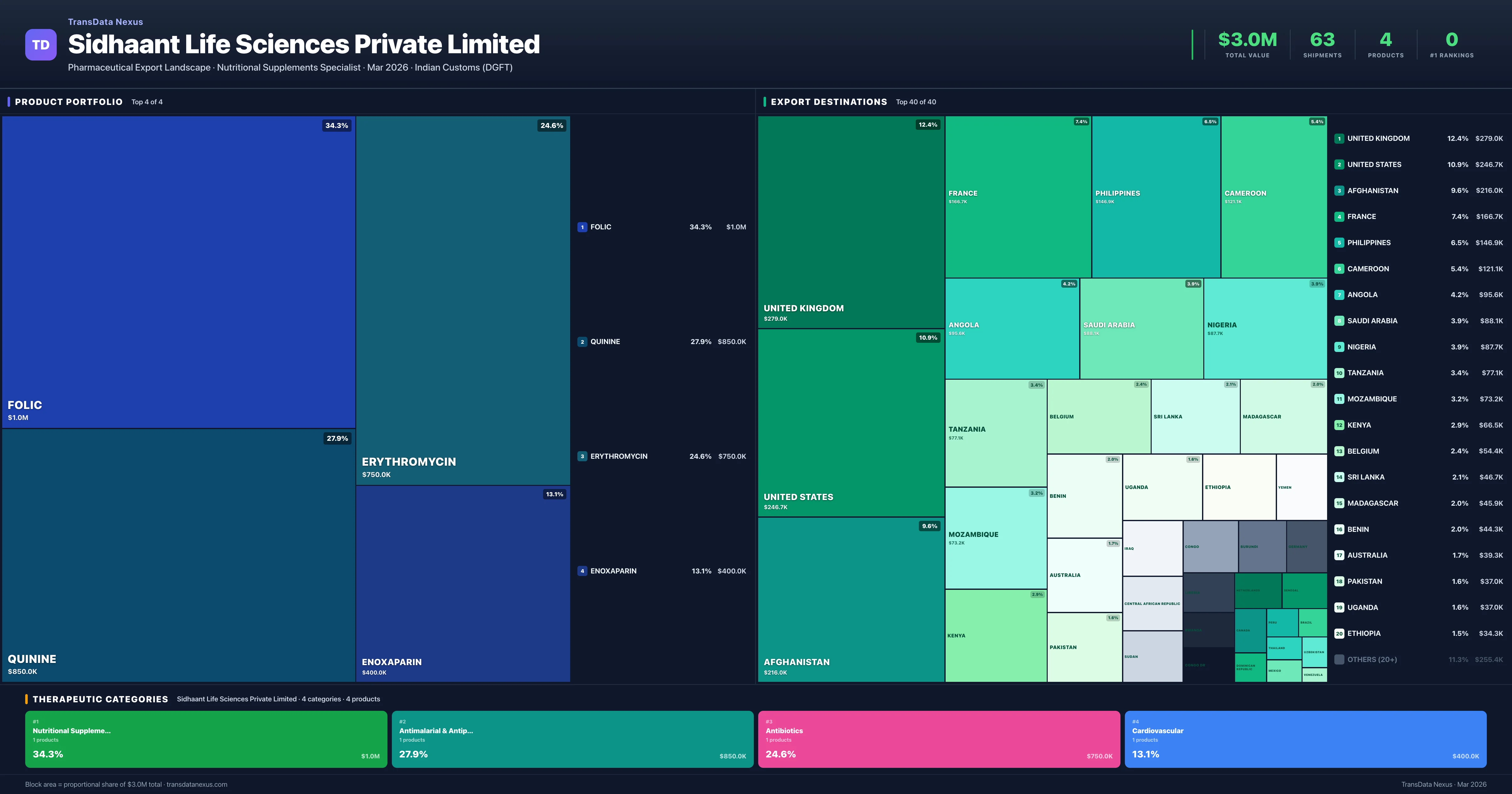 Sidhaant Life Sciences Private Limited is an Indian pharmaceutical exporter with a total trade value of $3.0M across 4 products in 4 therapeutic categories. Based on 63 verified export shipments from Indian Customs (DGFT) records, the company actively competes across multiple product segments. Top exports include Folic ($1.0M), Quinine ($850.0K), Erythromycin ($750.0K).