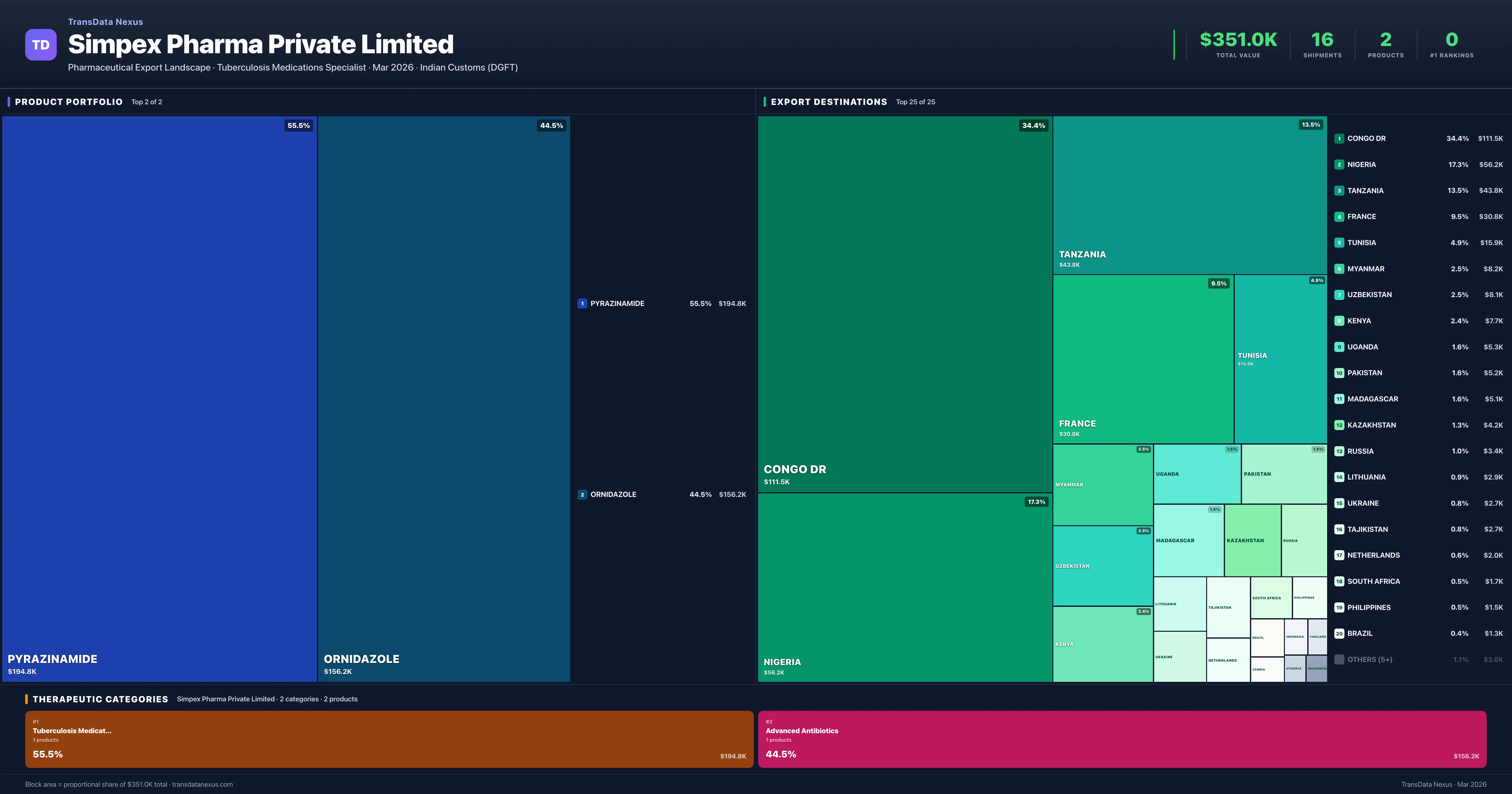 Simpex Pharma Private Limited exports 2 pharmaceutical products across 2 therapeutic categories. The top exports are Pyrazinamide ($194.8K), Ornidazole ($156.2K). Total export value is $351.0K.