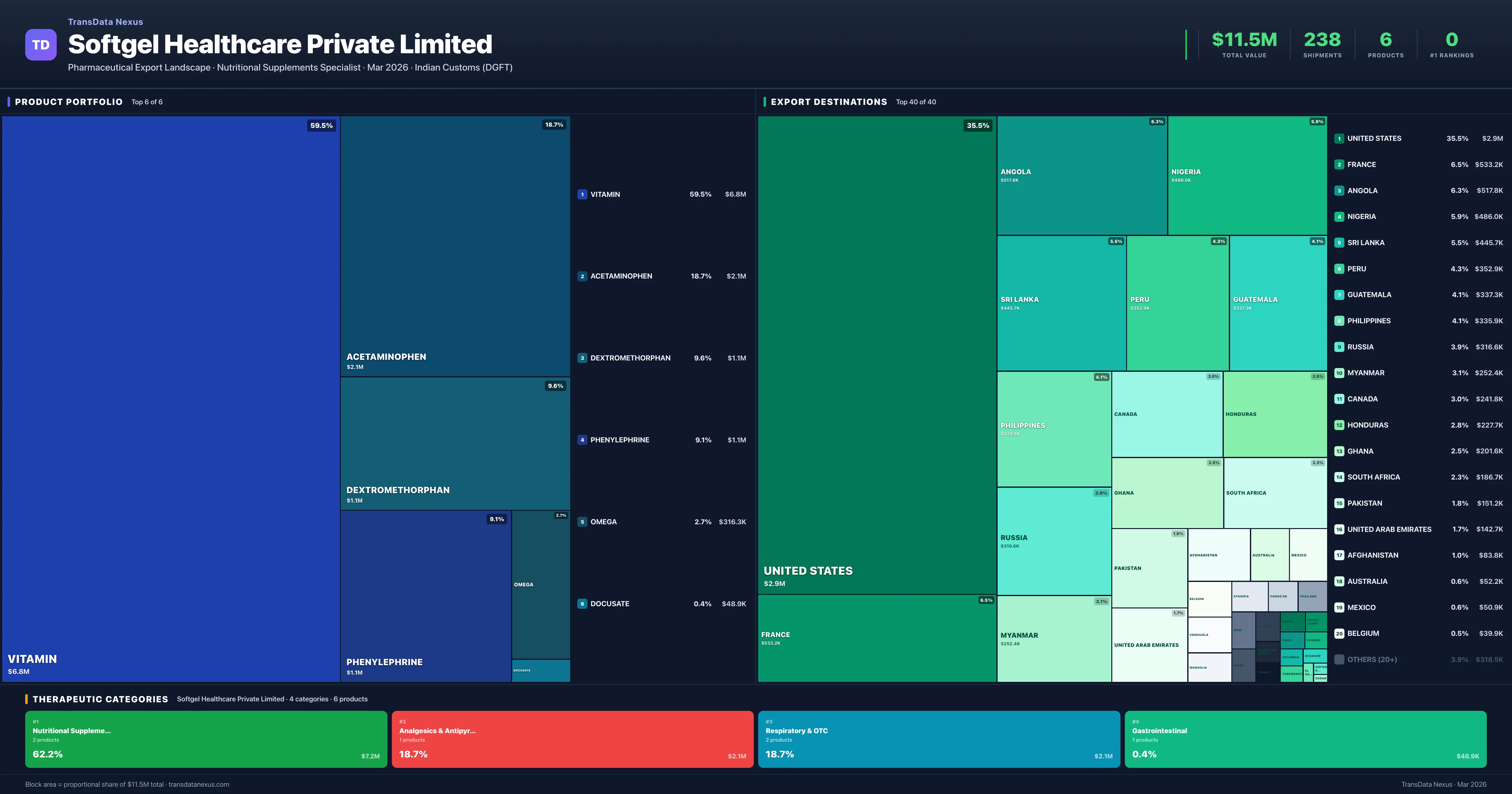 Softgel Healthcare Private Limited's total pharmaceutical export value is $11.5M, based on 238 verified shipments recorded in Indian Customs (DGFT) data.