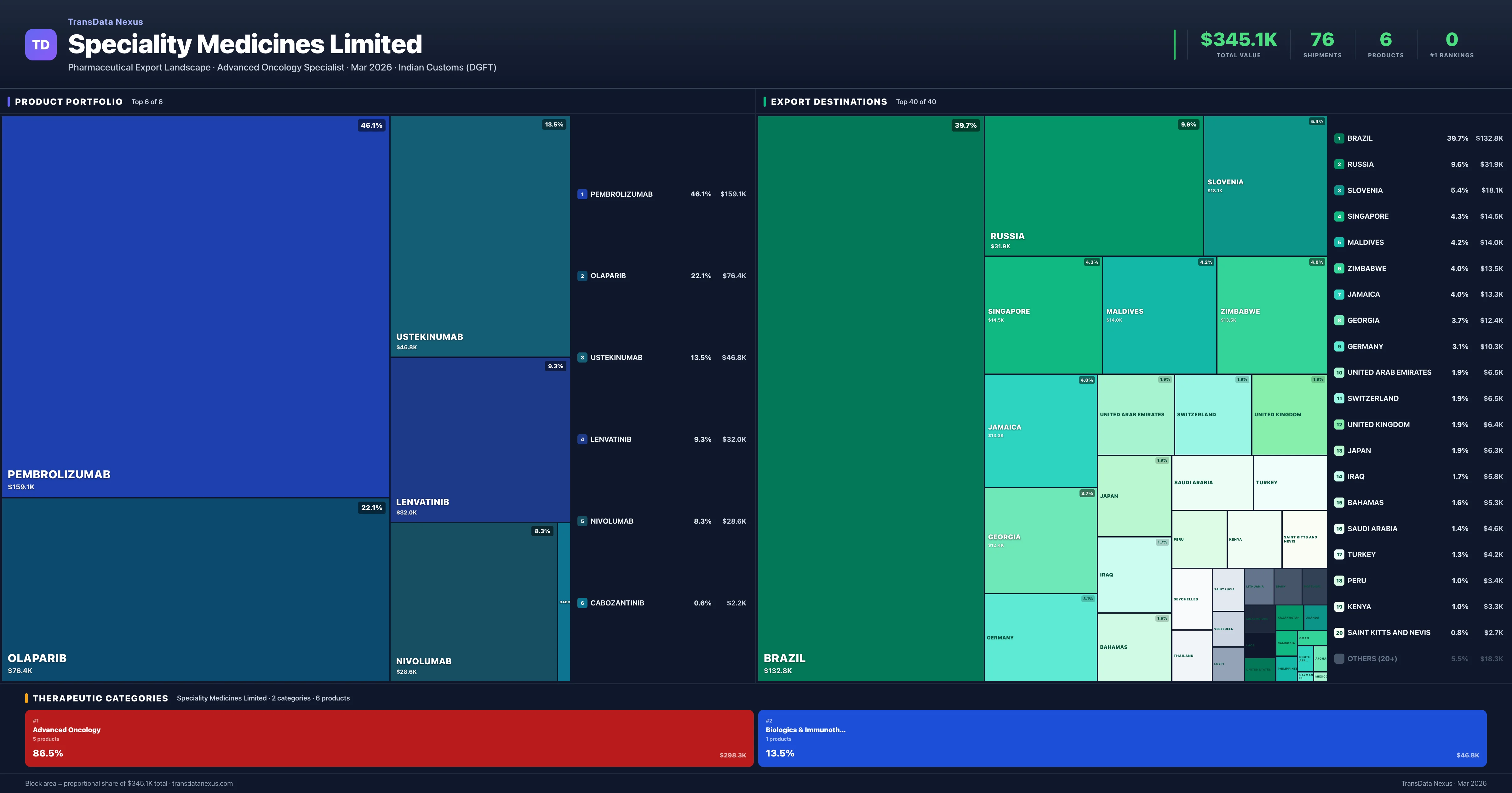 Speciality Medicines Limited is an Indian pharmaceutical exporter with a total trade value of $345.1K across 6 products in 2 therapeutic categories. Based on 76 verified export shipments from Indian Customs (DGFT) records, the company actively competes across multiple product segments. Top exports include Pembrolizumab ($159.1K), Olaparib ($76.4K), Ustekinumab ($46.8K).