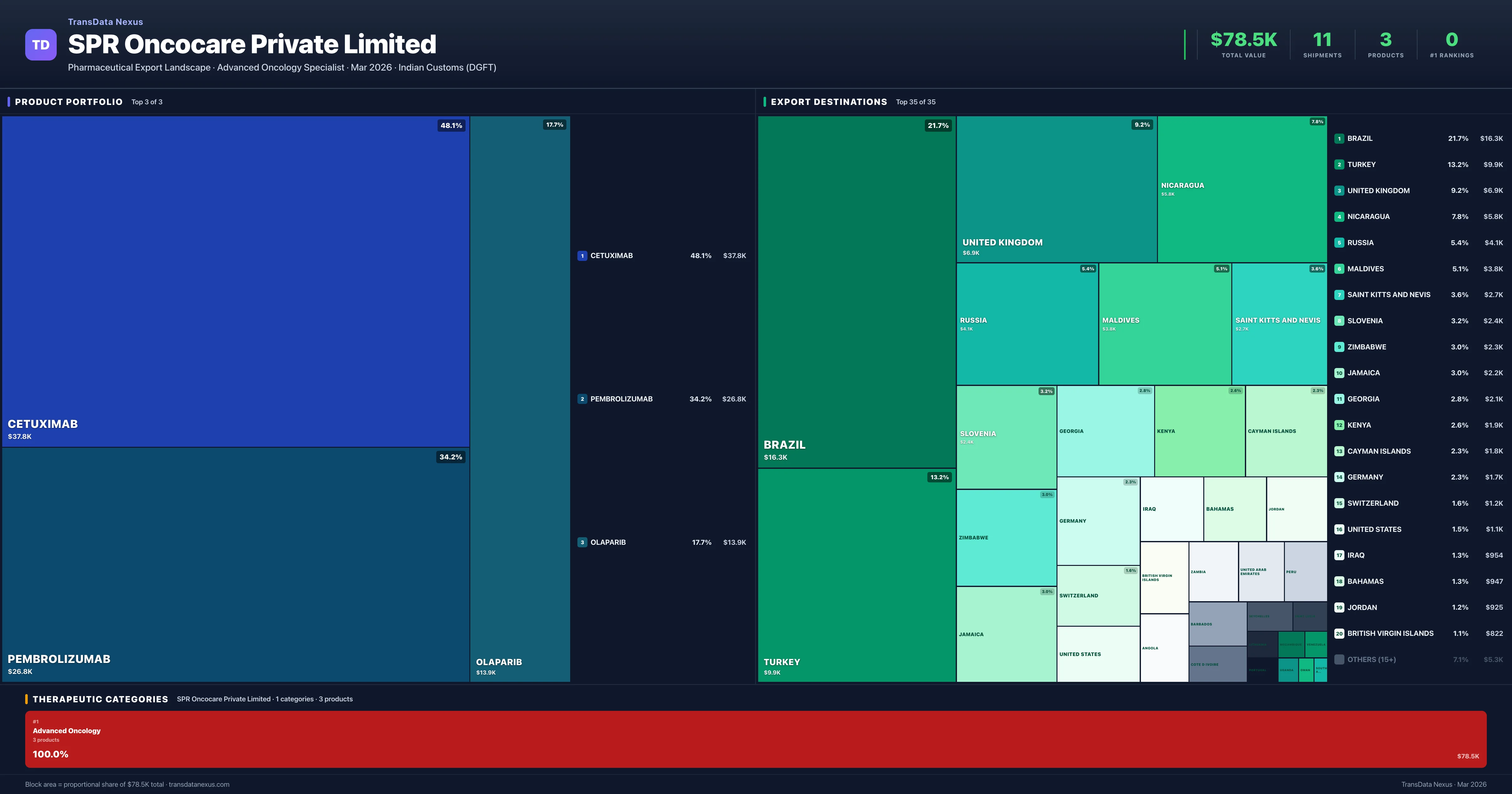 SPR Oncocare Private Limited exports 3 pharmaceutical products across 1 therapeutic categories. The top exports are Cetuximab ($37.8K), Pembrolizumab ($26.8K), Olaparib ($13.9K). Total export value is $78.5K.