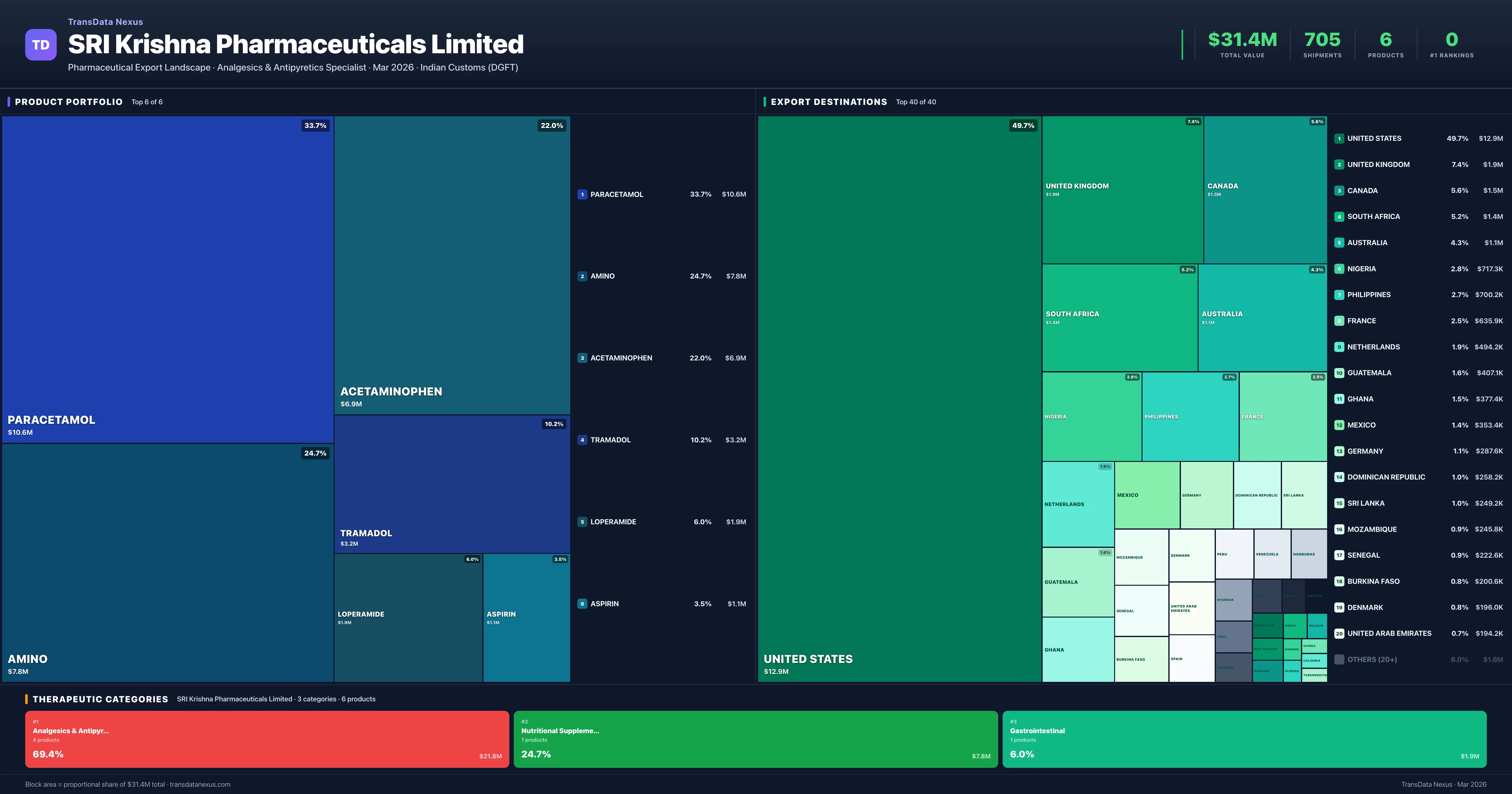 SRI Krishna Pharmaceuticals Limited operates across 3 therapeutic categories, with Analgesics & Antipyretics (69.4%), Nutritional Supplements (24.7%), Gastrointestinal (6.0%) representing the largest segments by export value. The portfolio is concentrated — the top 5 products account for 97% of total exports.