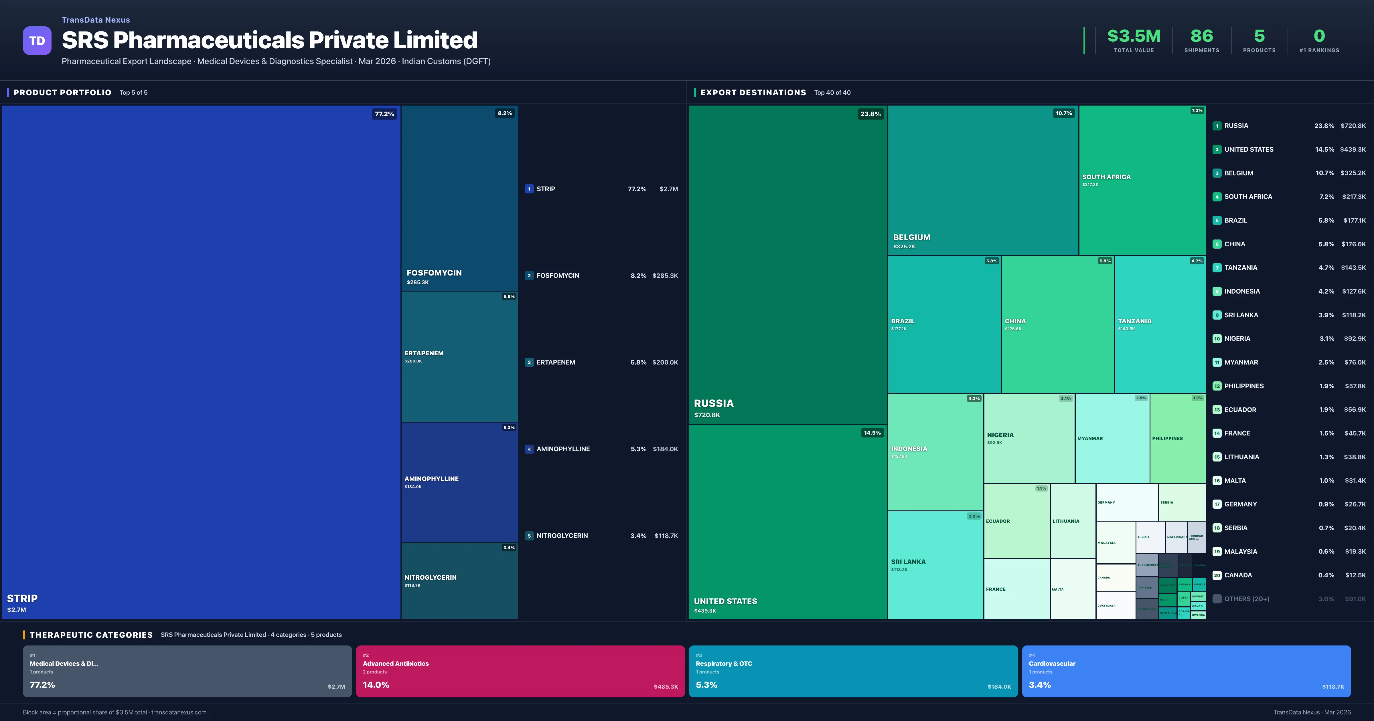 SRS Pharmaceuticals Private Limited is an Indian pharmaceutical exporter with a total trade value of $3.5M across 5 products in 4 therapeutic categories. Based on 86 verified export shipments from Indian Customs (DGFT) records, the company actively competes across multiple product segments. Top exports include Strip ($2.7M), Fosfomycin ($285.3K), Ertapenem ($200.0K).
