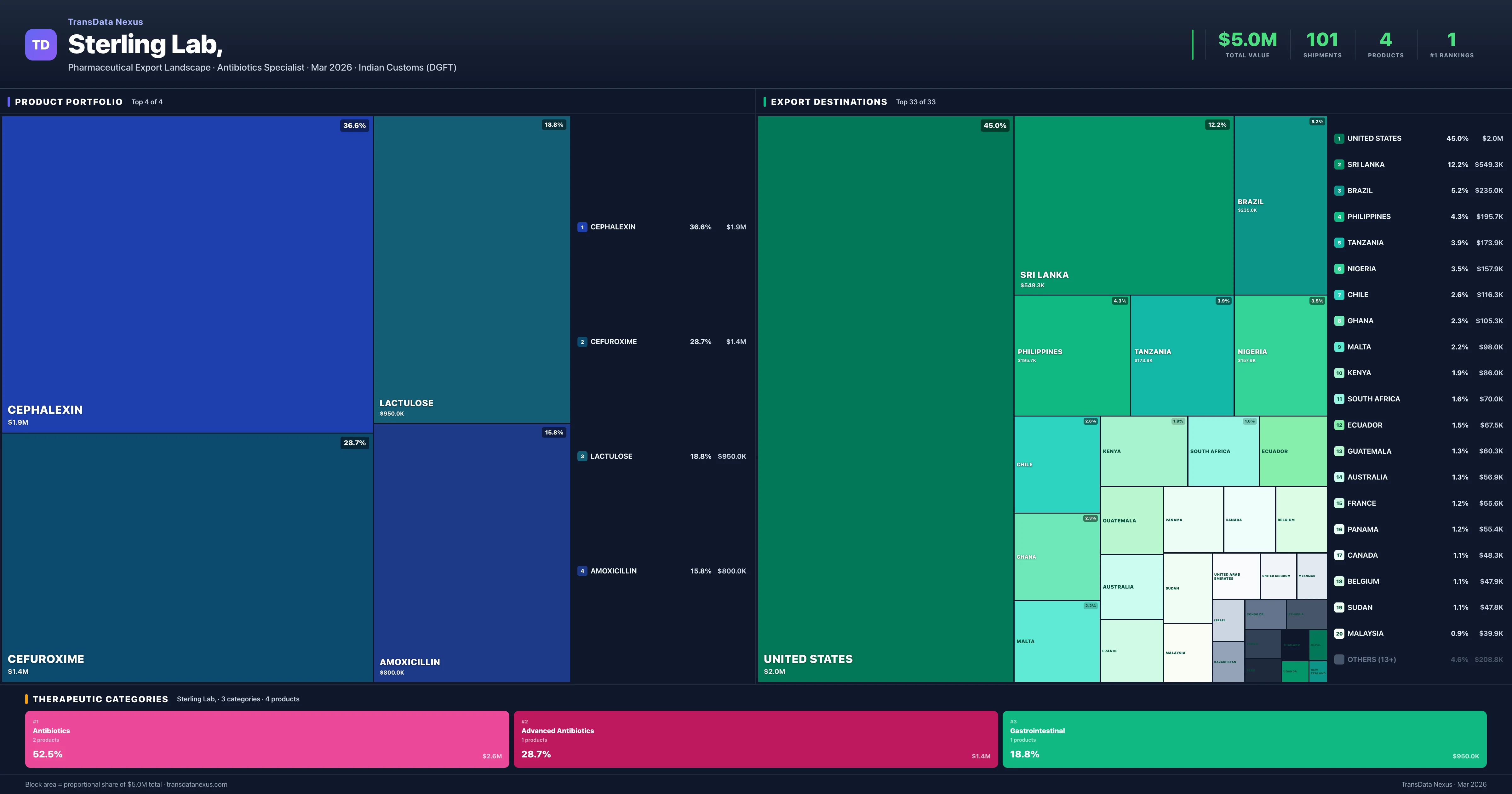 Sterling Lab, is an Indian pharmaceutical exporter with a total trade value of $5.0M across 4 products in 3 therapeutic categories. Based on 101 verified export shipments from Indian Customs (DGFT) records, Sterling Lab, is the #1 Indian exporter in 1 product including Lactulose. Top exports include Cephalexin ($1.9M), Cefuroxime ($1.4M), Lactulose ($950.0K).
