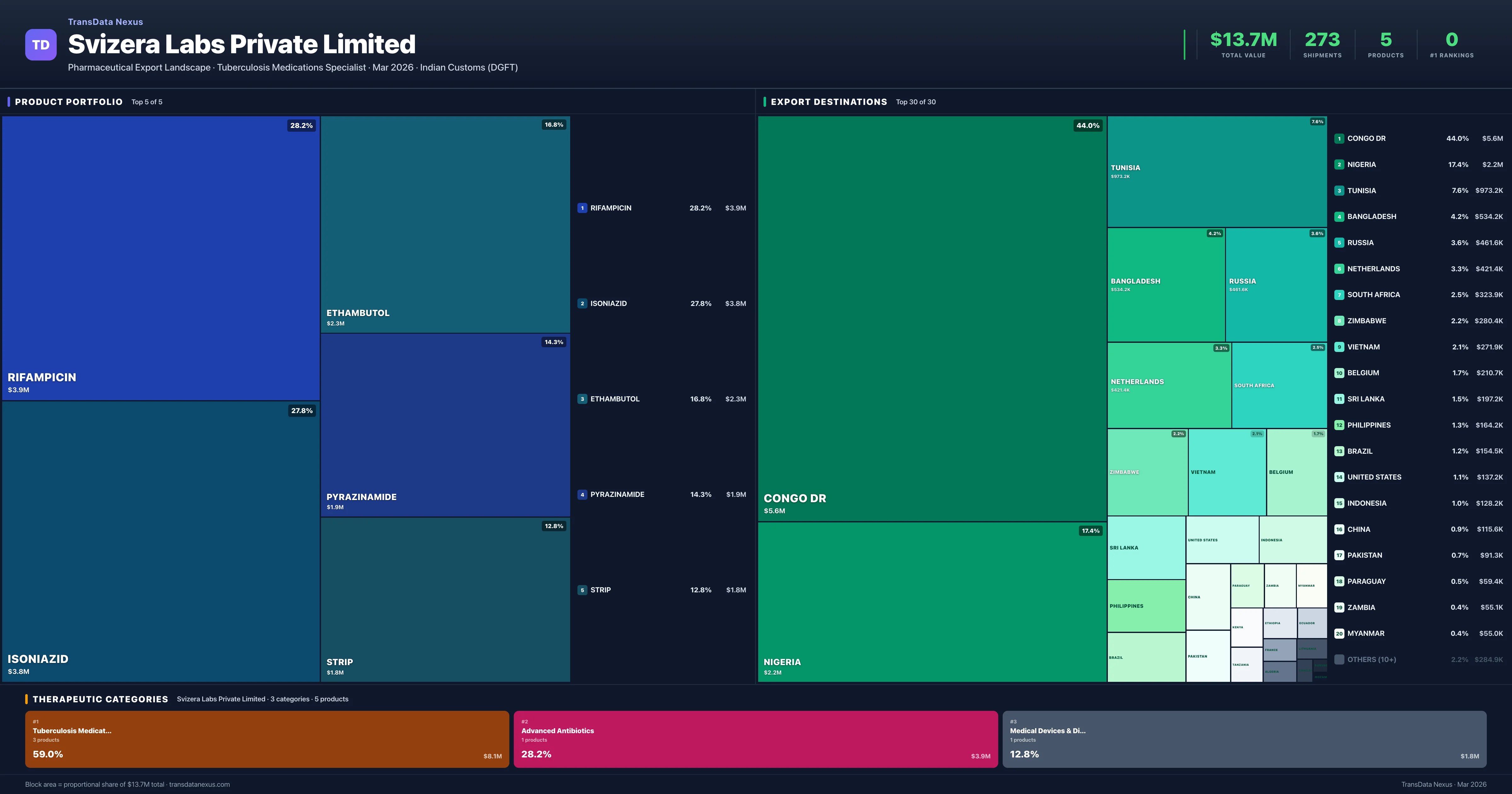 Svizera Labs Private Limited exports 5 pharmaceutical products across 3 therapeutic categories. The top exports are Rifampicin ($3.9M), Isoniazid ($3.8M), Ethambutol ($2.3M), Pyrazinamide ($1.9M), Strip ($1.8M). Total export value is $13.7M.