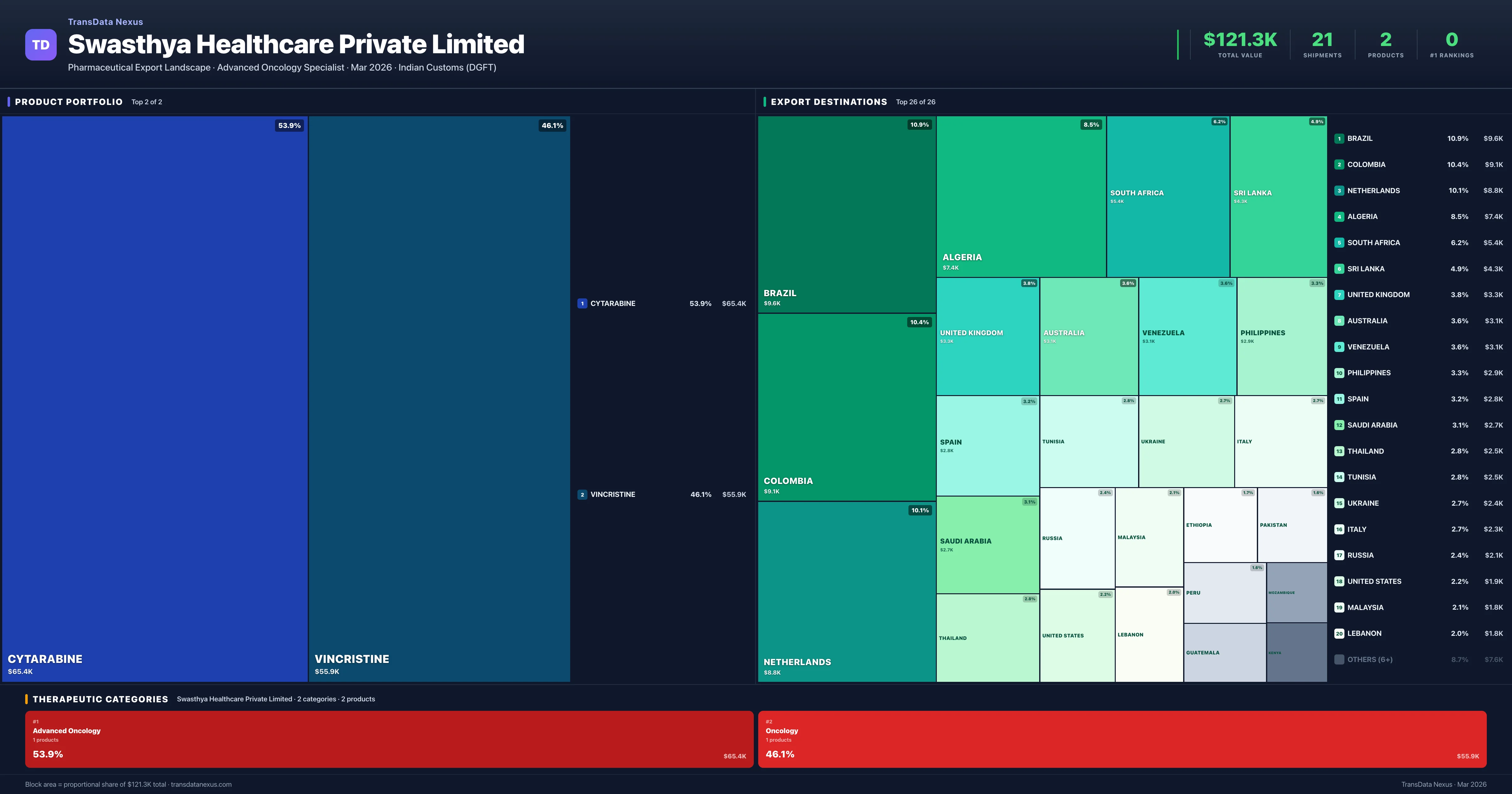 Swasthya Healthcare Private Limited is an Indian pharmaceutical exporter with a total trade value of $121.3K across 2 products in 2 therapeutic categories. Based on 21 verified export shipments from Indian Customs (DGFT) records, the company actively competes across multiple product segments. Top exports include Cytarabine ($65.4K), Vincristine ($55.9K), .