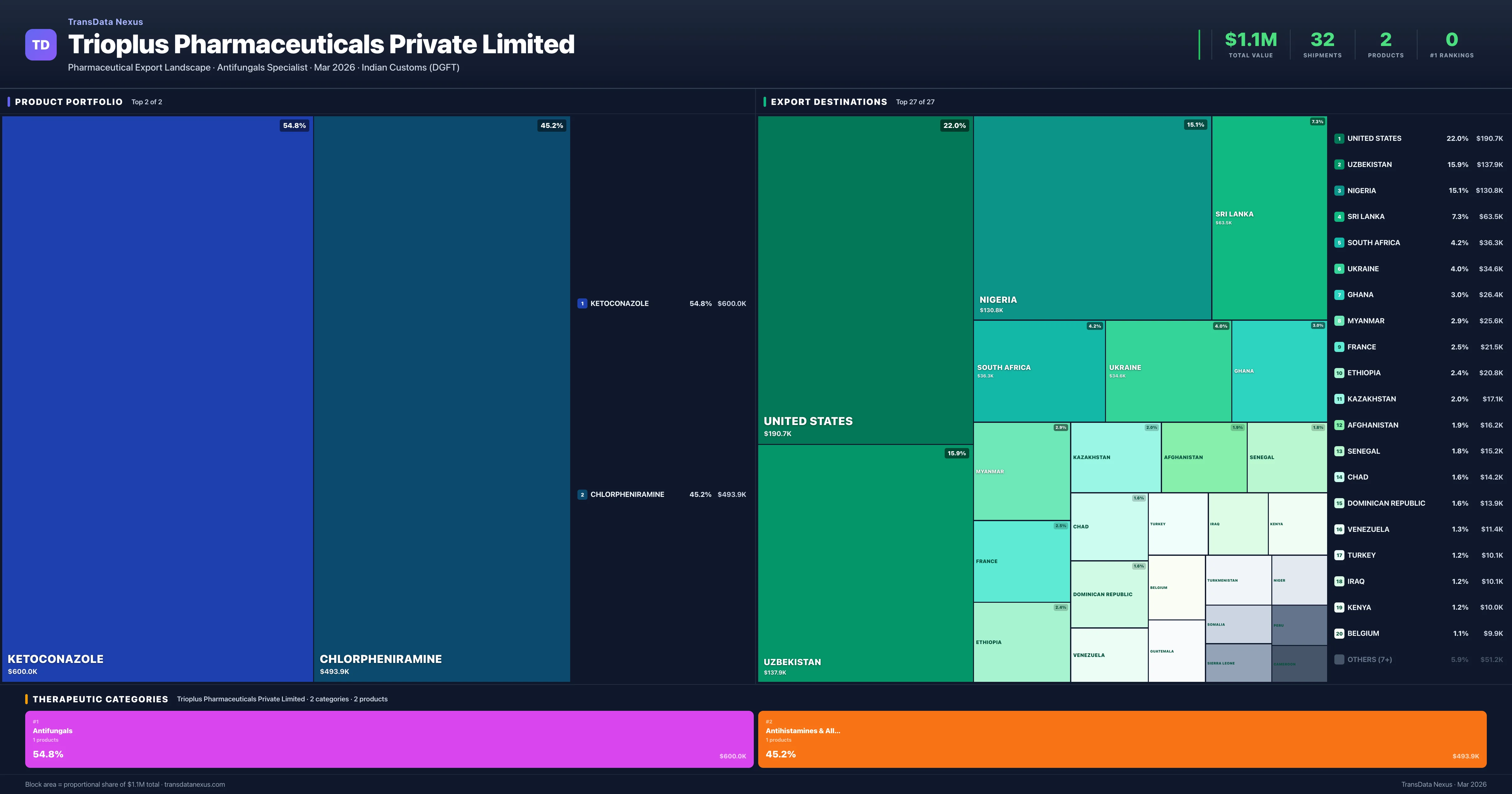 Trioplus Pharmaceuticals Private Limited is an Indian pharmaceutical exporter with a total trade value of $1.1M across 2 products in 2 therapeutic categories. Based on 32 verified export shipments from Indian Customs (DGFT) records, the company actively competes across multiple product segments. Top exports include Ketoconazole ($600.0K), Chlorpheniramine ($493.9K), .