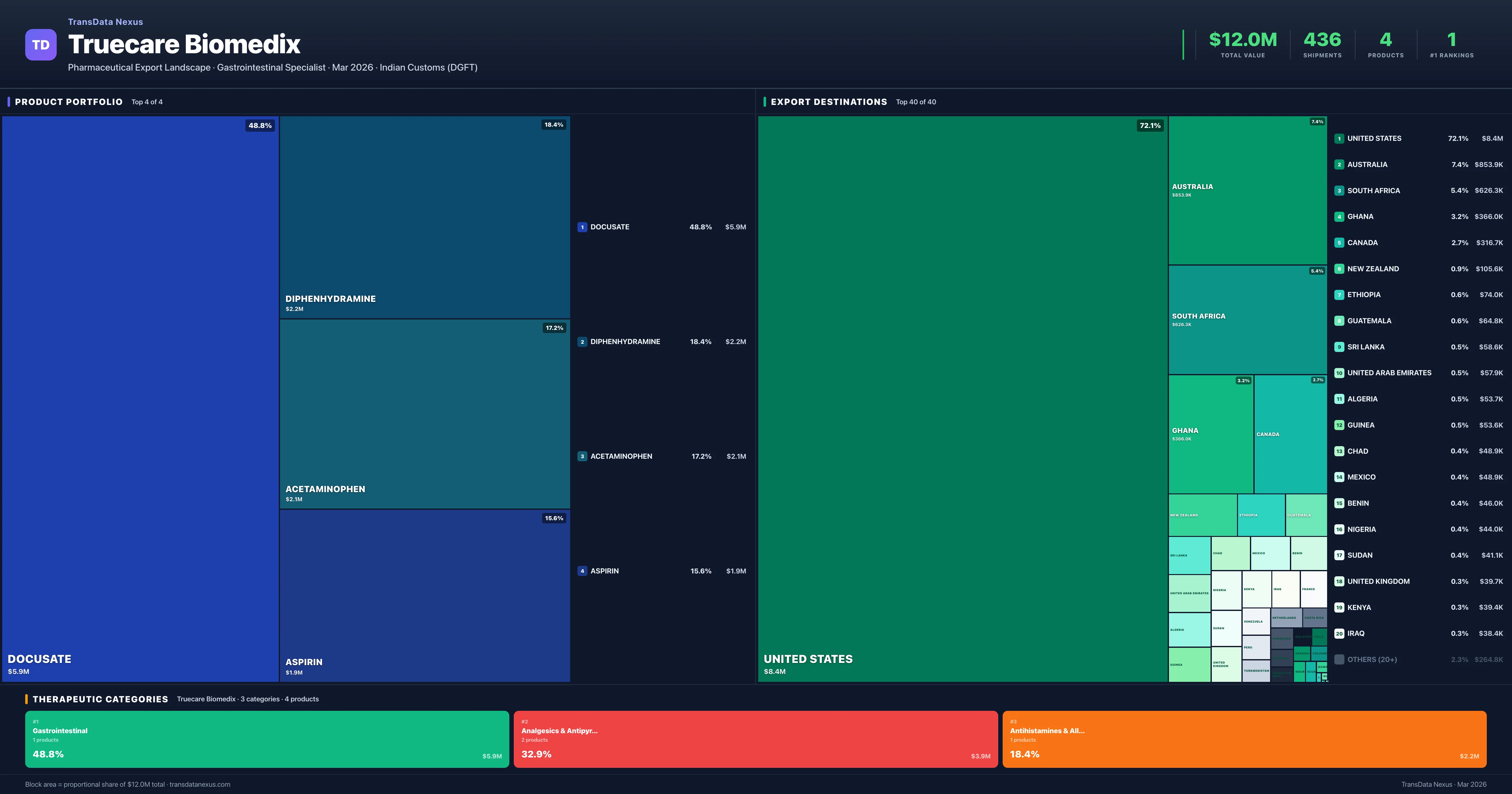 Truecare Biomedix is an Indian pharmaceutical exporter with a total trade value of $12.0M across 4 products in 3 therapeutic categories. Based on 436 verified export shipments from Indian Customs (DGFT) records, Truecare Biomedix is the #1 Indian exporter in 1 product including Docusate. Top exports include Docusate ($5.9M), Diphenhydramine ($2.2M), Acetaminophen ($2.1M).