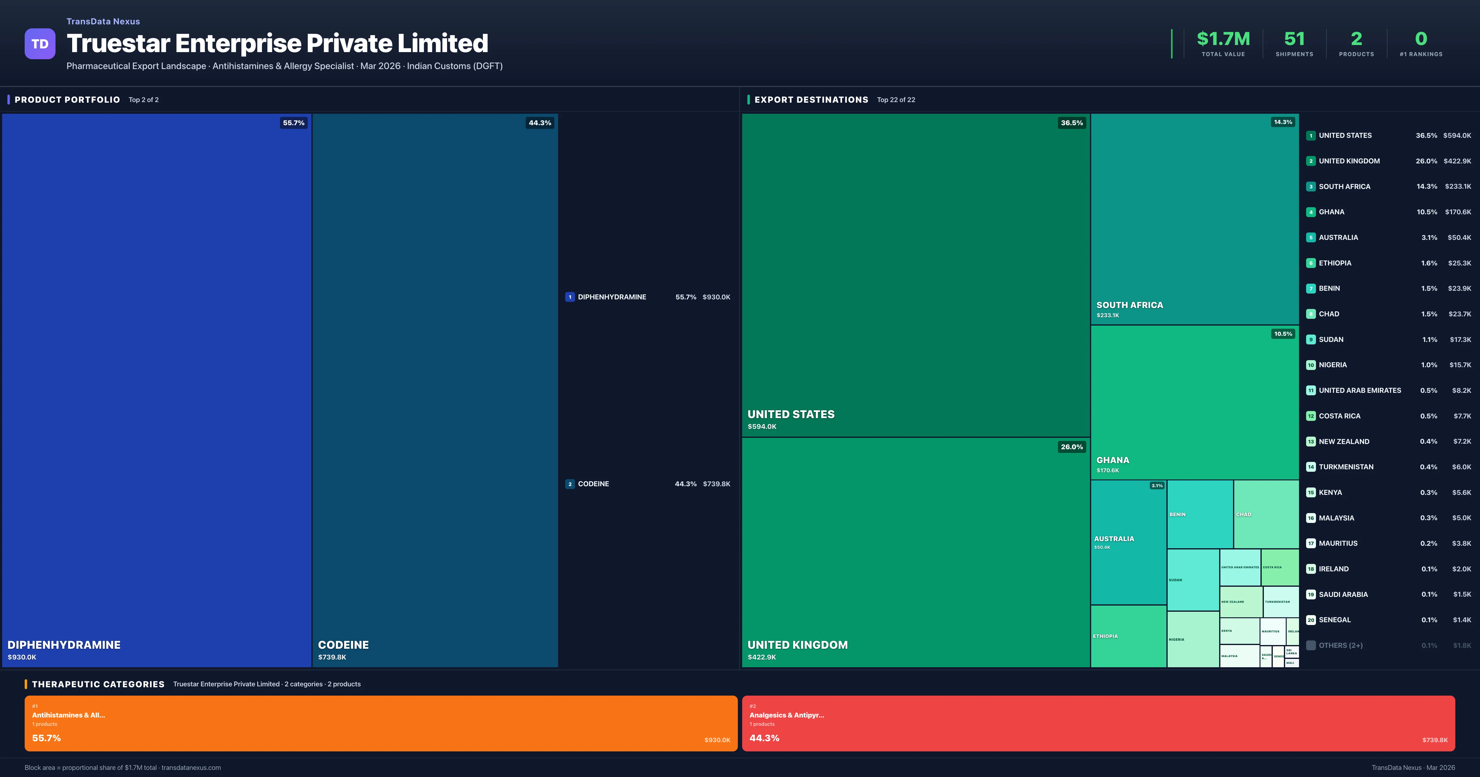 Truestar Enterprise Private Limited exports 2 pharmaceutical products across 2 therapeutic categories. The top exports are Diphenhydramine ($930.0K), Codeine ($739.8K). Total export value is $1.7M.
