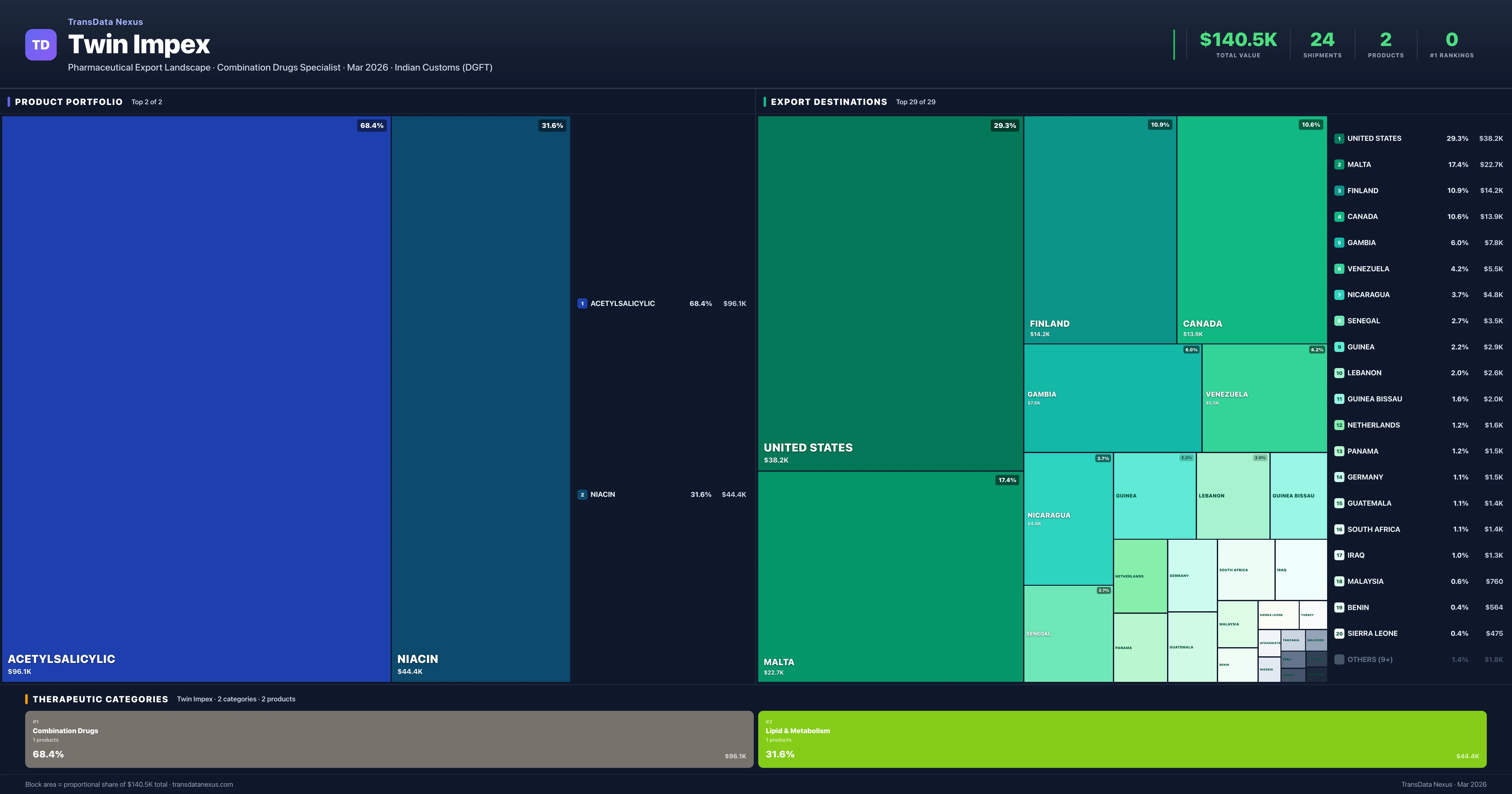 Twin Impex exports 2 pharmaceutical products across 2 therapeutic categories. The top exports are Acetylsalicylic ($96.1K), Niacin ($44.4K). Total export value is $140.5K.