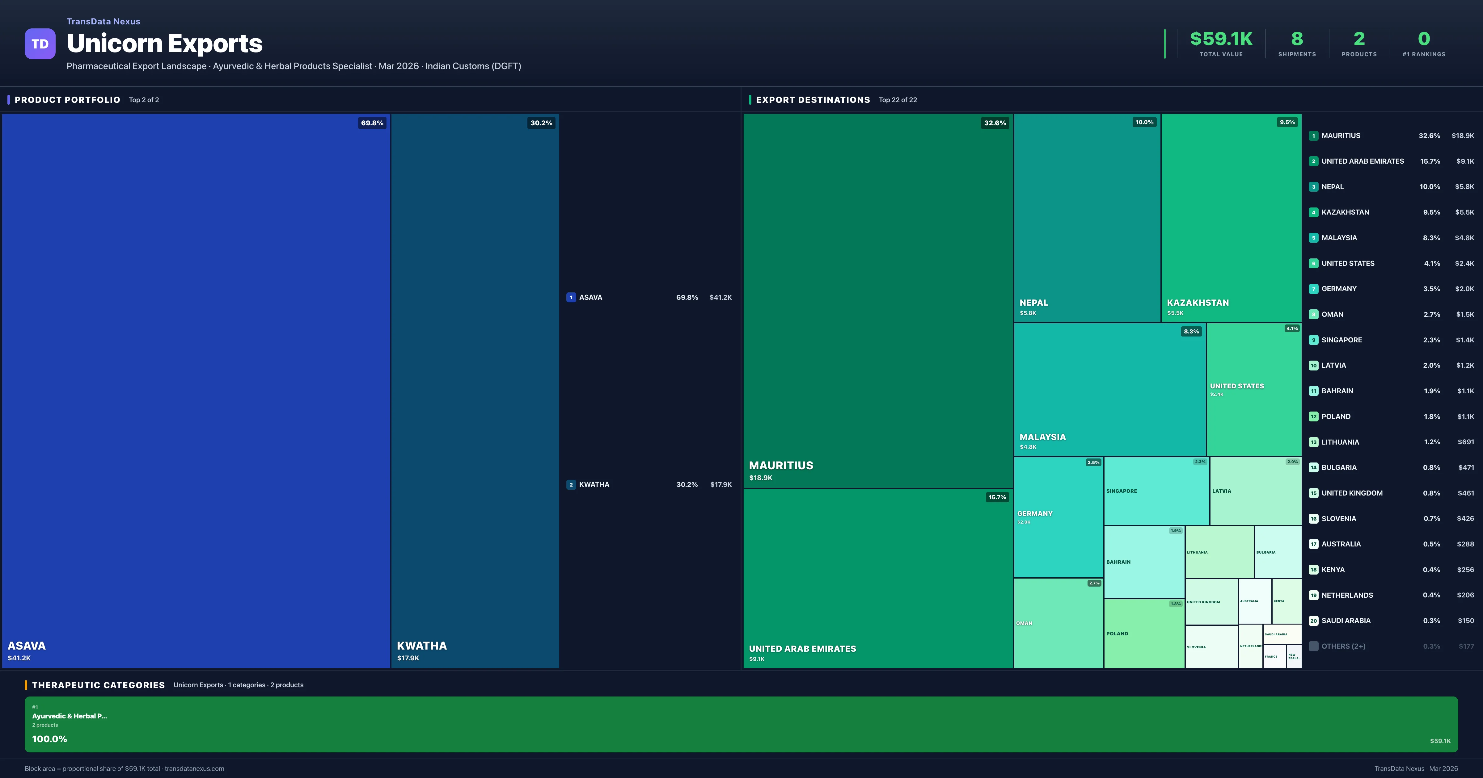 Unicorn Exports is an Indian pharmaceutical exporter with a total trade value of $59.1K across 2 products in 1 therapeutic categories. Based on 8 verified export shipments from Indian Customs (DGFT) records, the company actively competes across multiple product segments. Top exports include Asava ($41.2K), Kwatha ($17.9K), .