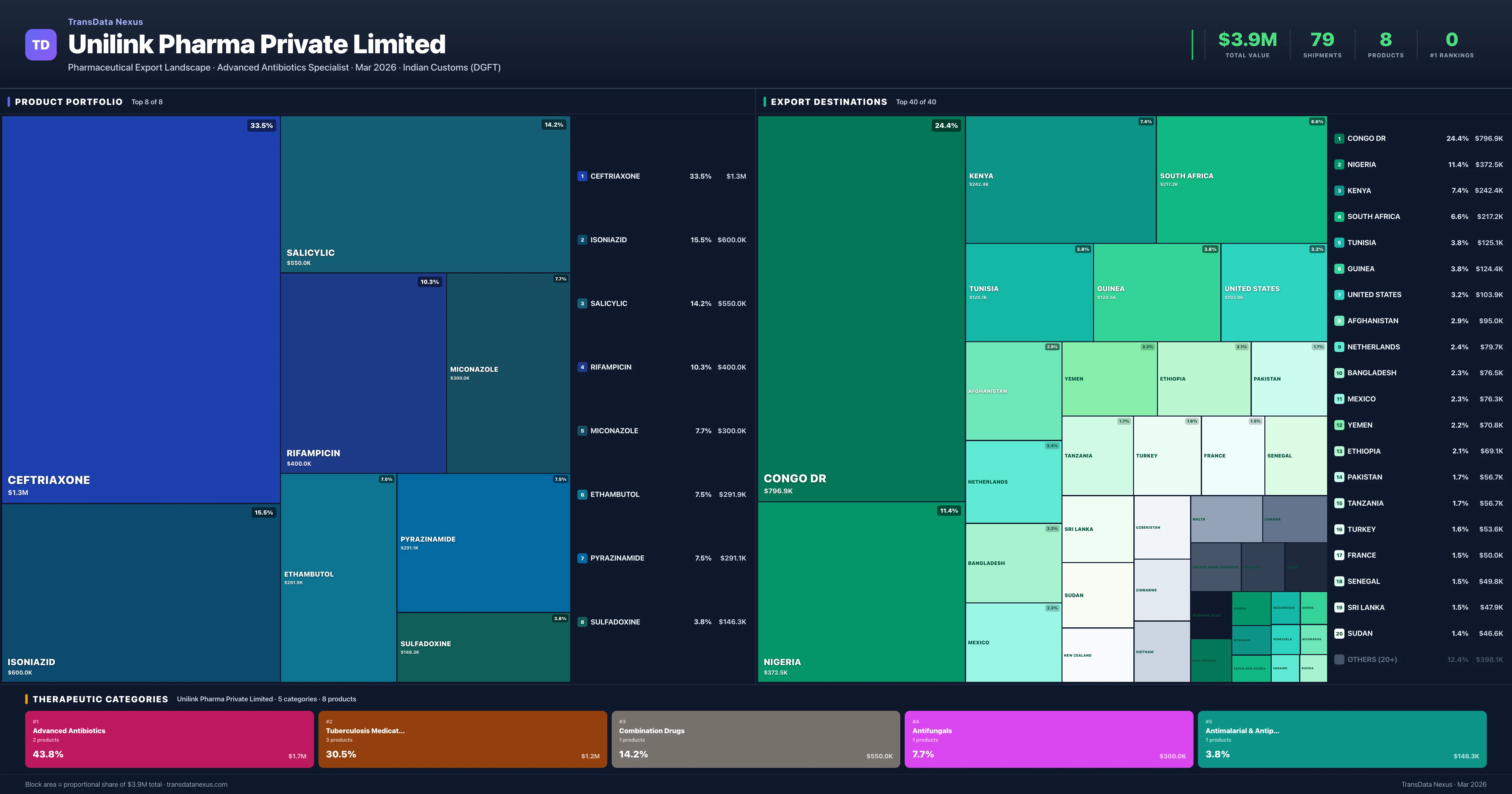 Unilink Pharma Private Limited operates across 5 therapeutic categories, with Advanced Antibiotics (43.8%), Tuberculosis Medications (30.5%), Combination Drugs (14.2%) representing the largest segments by export value. The portfolio is concentrated — the top 5 products account for 81% of total exports.