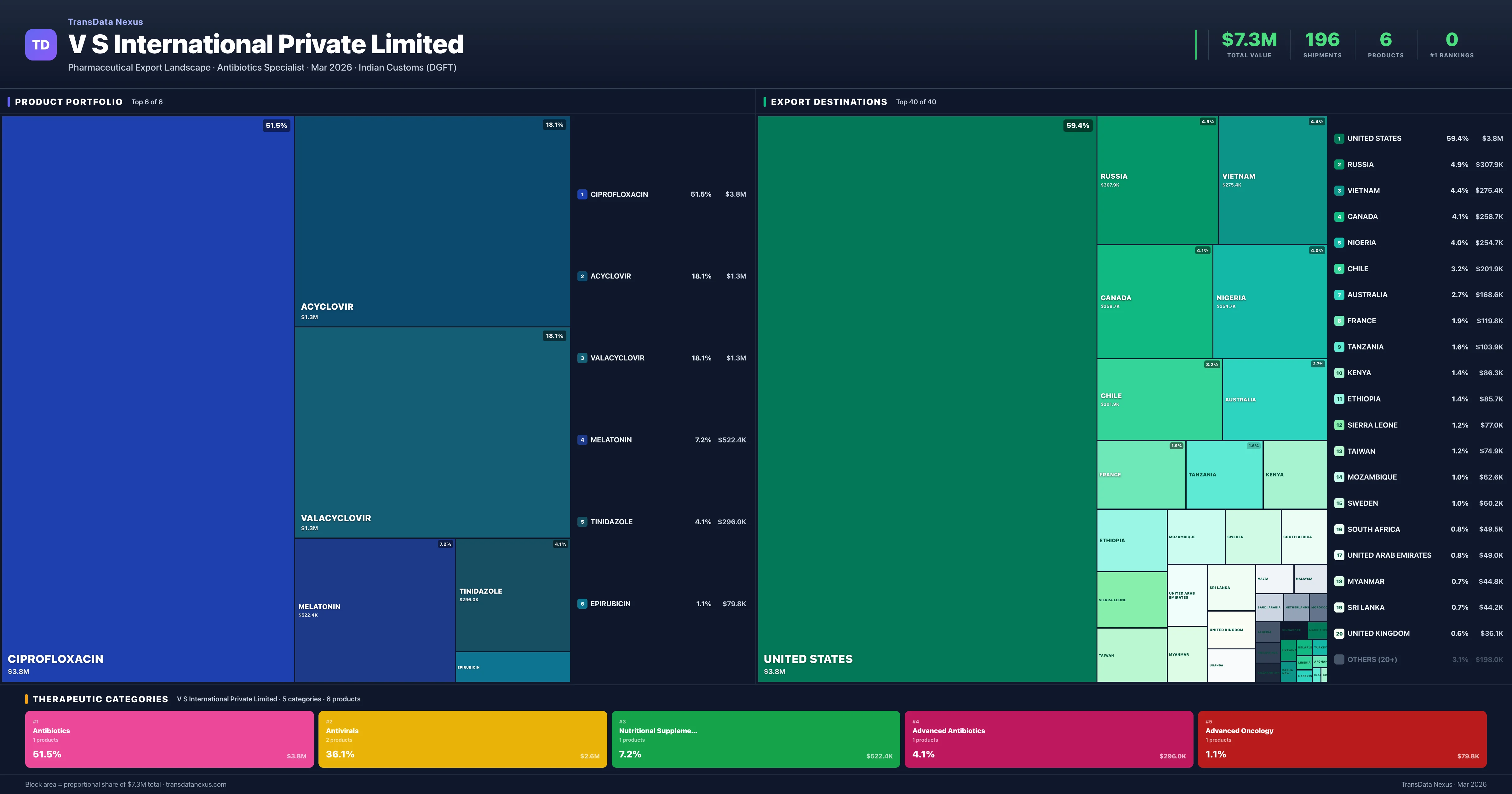 V S International Private Limited's total pharmaceutical export value is $7.3M, based on 196 verified shipments recorded in Indian Customs (DGFT) data.