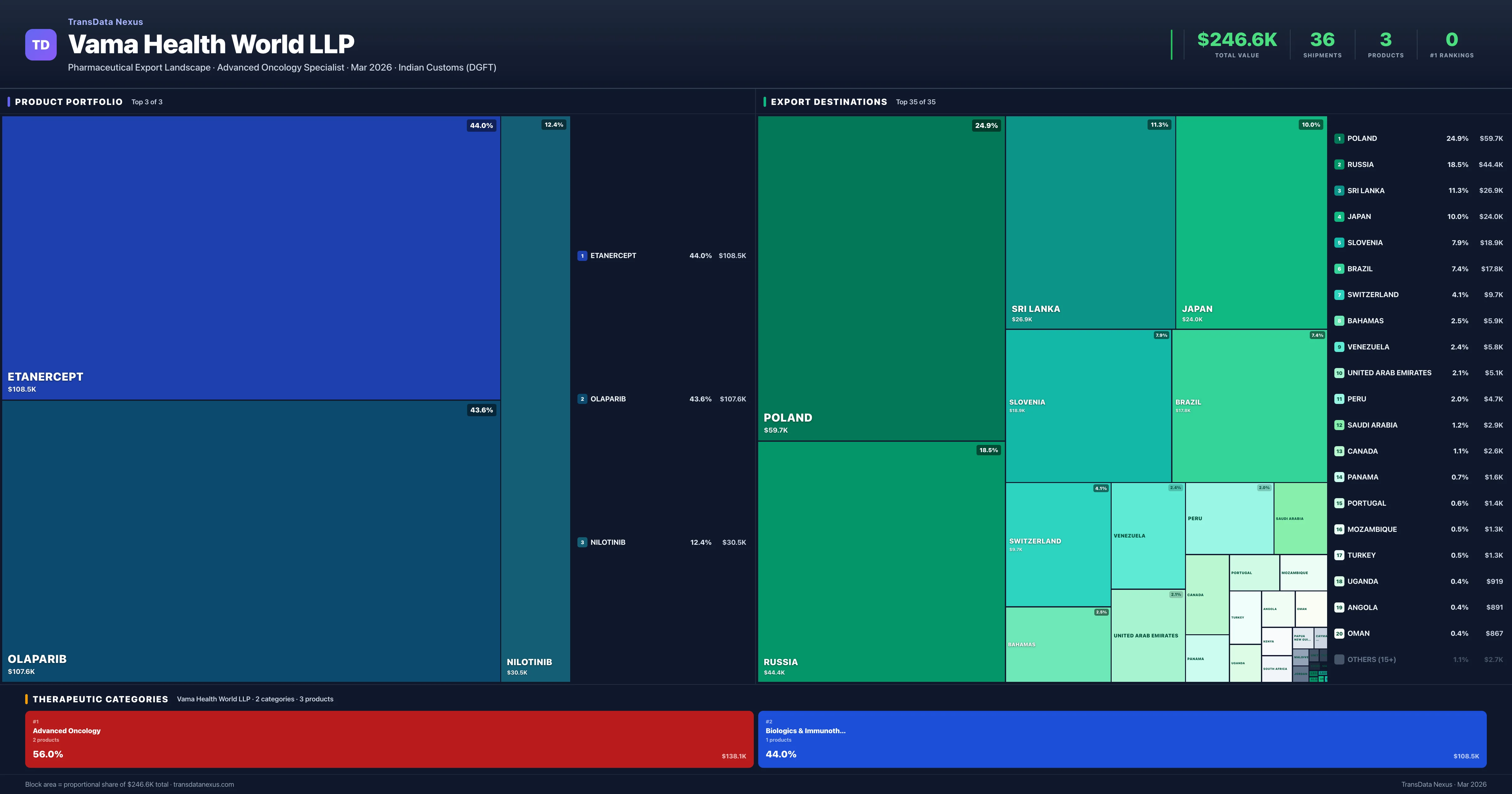 Vama Health World LLP is an Indian pharmaceutical exporter with a total trade value of $246.6K across 3 products in 2 therapeutic categories. Based on 36 verified export shipments from Indian Customs (DGFT) records, the company actively competes across multiple product segments. Top exports include Etanercept ($108.5K), Olaparib ($107.6K), Nilotinib ($30.5K).