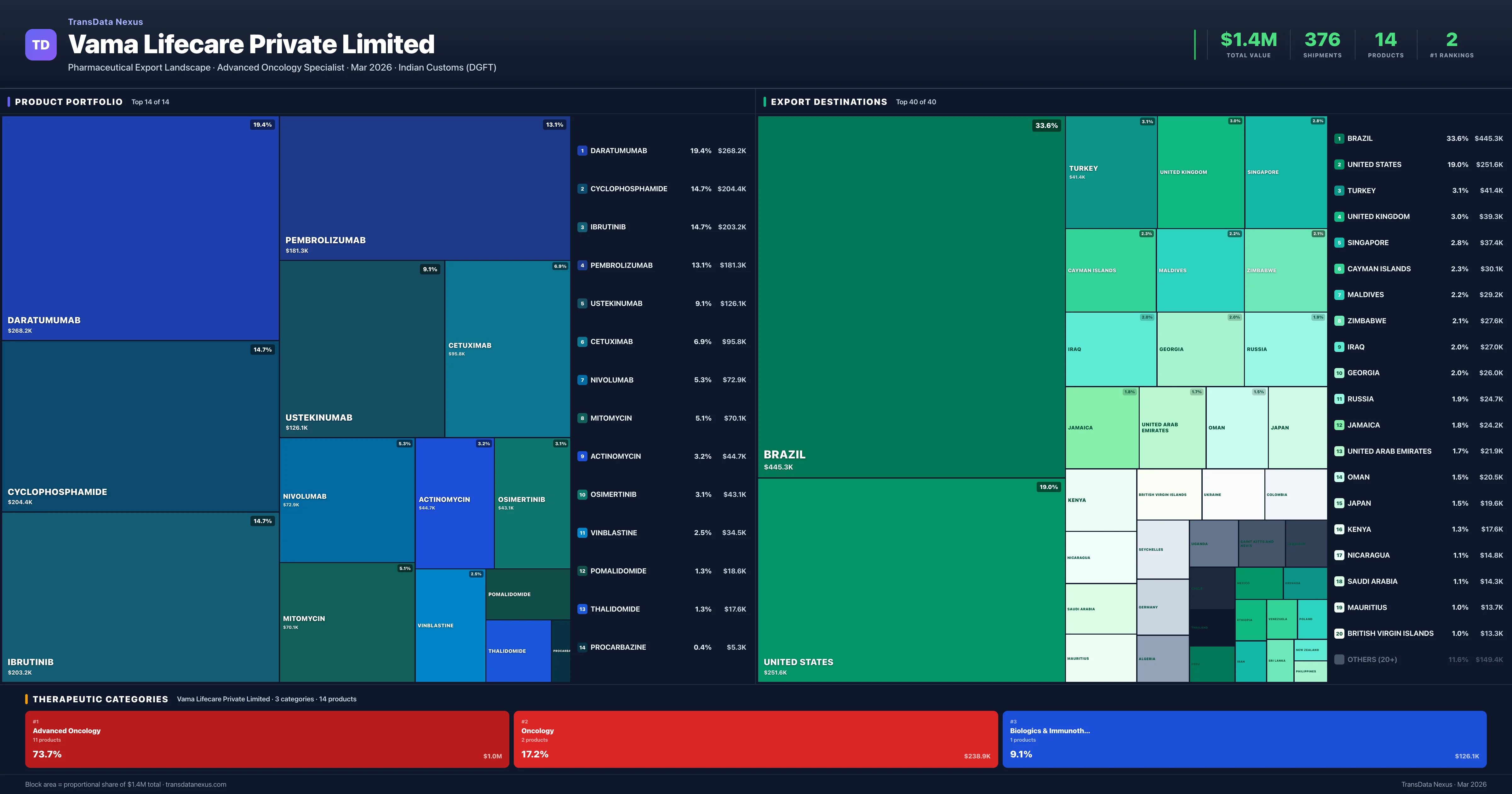 Vama Lifecare Private Limited is an Indian pharmaceutical exporter with a total trade value of $1.4M across 14 products in 3 therapeutic categories. Based on 376 verified export shipments from Indian Customs (DGFT) records, Vama Lifecare Private Limited is the #1 Indian exporter in 2 products including Daratumumab, Cetuximab. Top exports include Daratumumab ($268.2K), Cyclophosphamide ($204.4K), Ibrutinib ($203.2K).