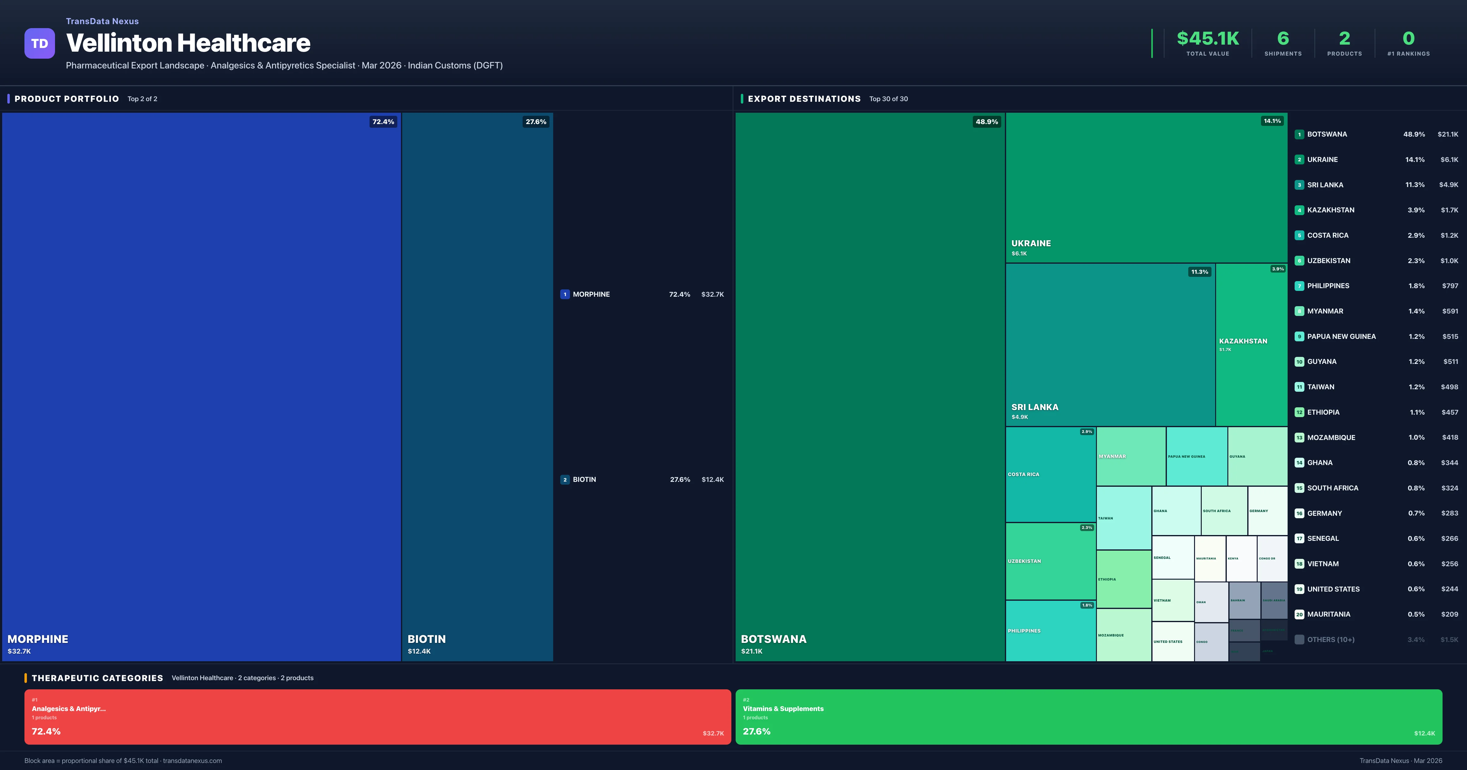 Vellinton Healthcare is an Indian pharmaceutical exporter with a total trade value of $45.1K across 2 products in 2 therapeutic categories. Based on 6 verified export shipments from Indian Customs (DGFT) records, the company actively competes across multiple product segments. Top exports include Morphine ($32.7K), Biotin ($12.4K), .