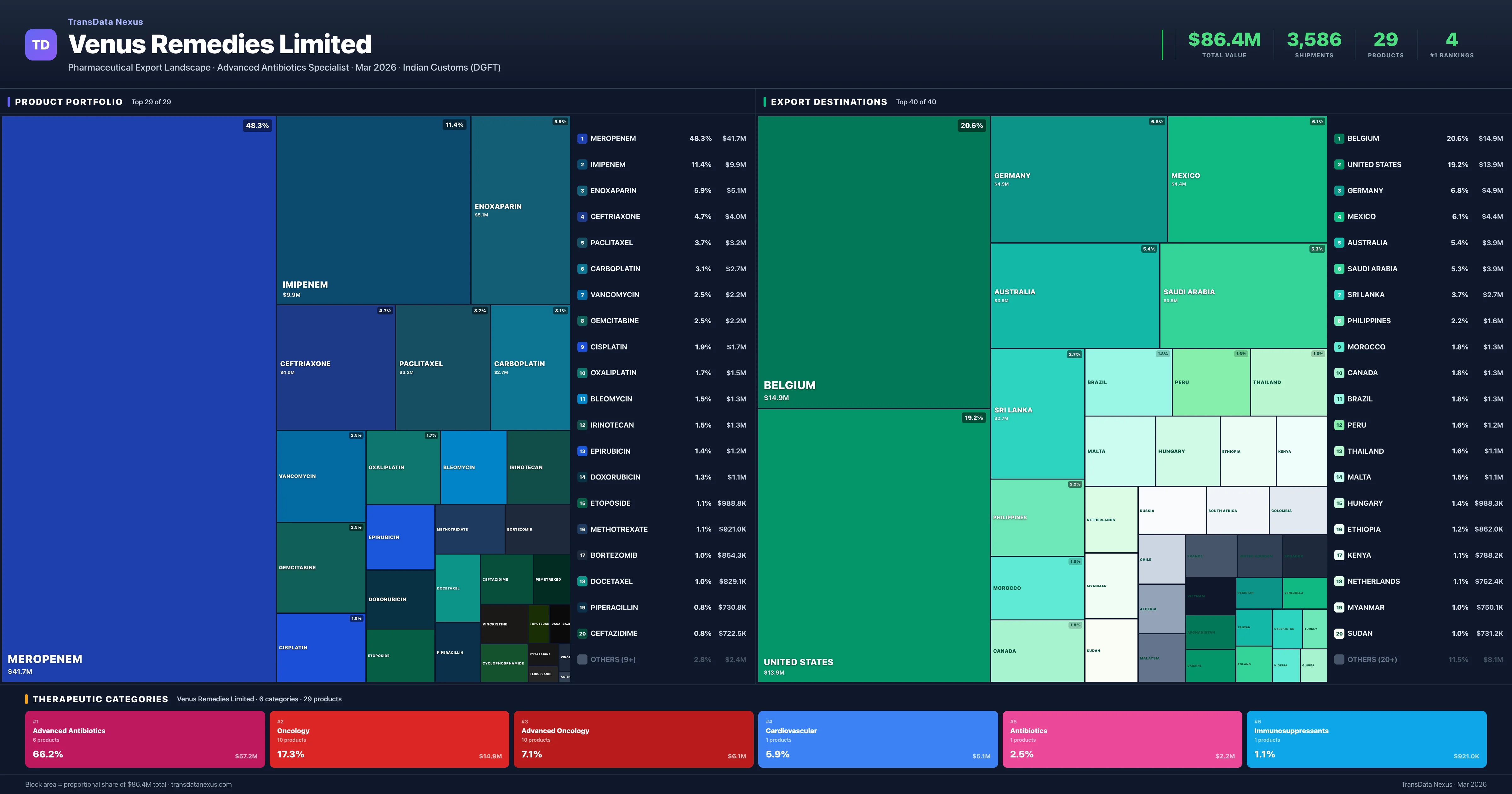 Venus Remedies Limited exports 29 pharmaceutical products across 6 therapeutic categories. Market leader (#1 exporter) in 4 products.
