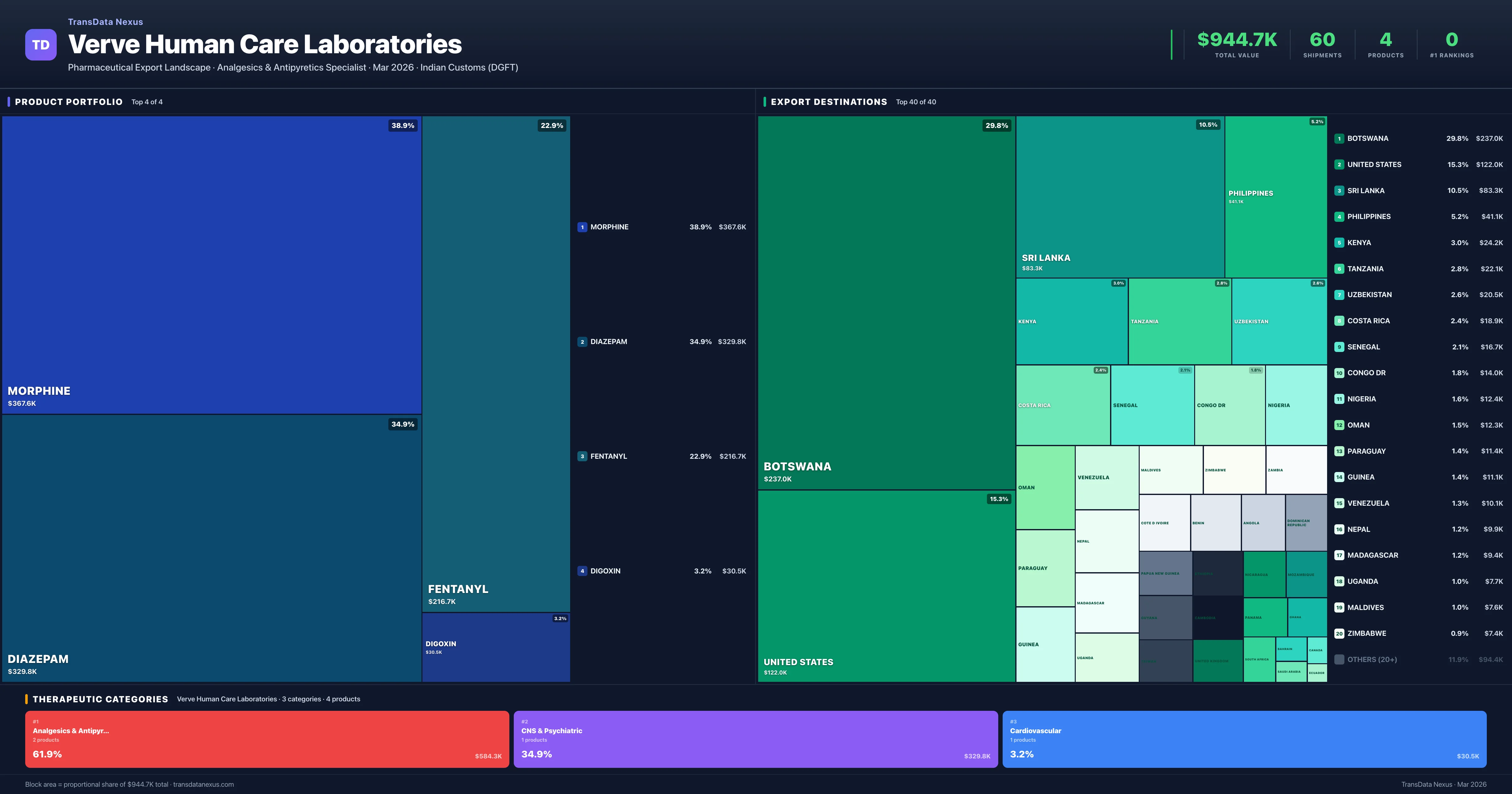 Verve Human Care Laboratories exports 4 pharmaceutical products across 3 therapeutic categories. The top exports are Morphine ($367.6K), Diazepam ($329.8K), Fentanyl ($216.7K), Digoxin ($30.5K). Total export value is $944.7K.