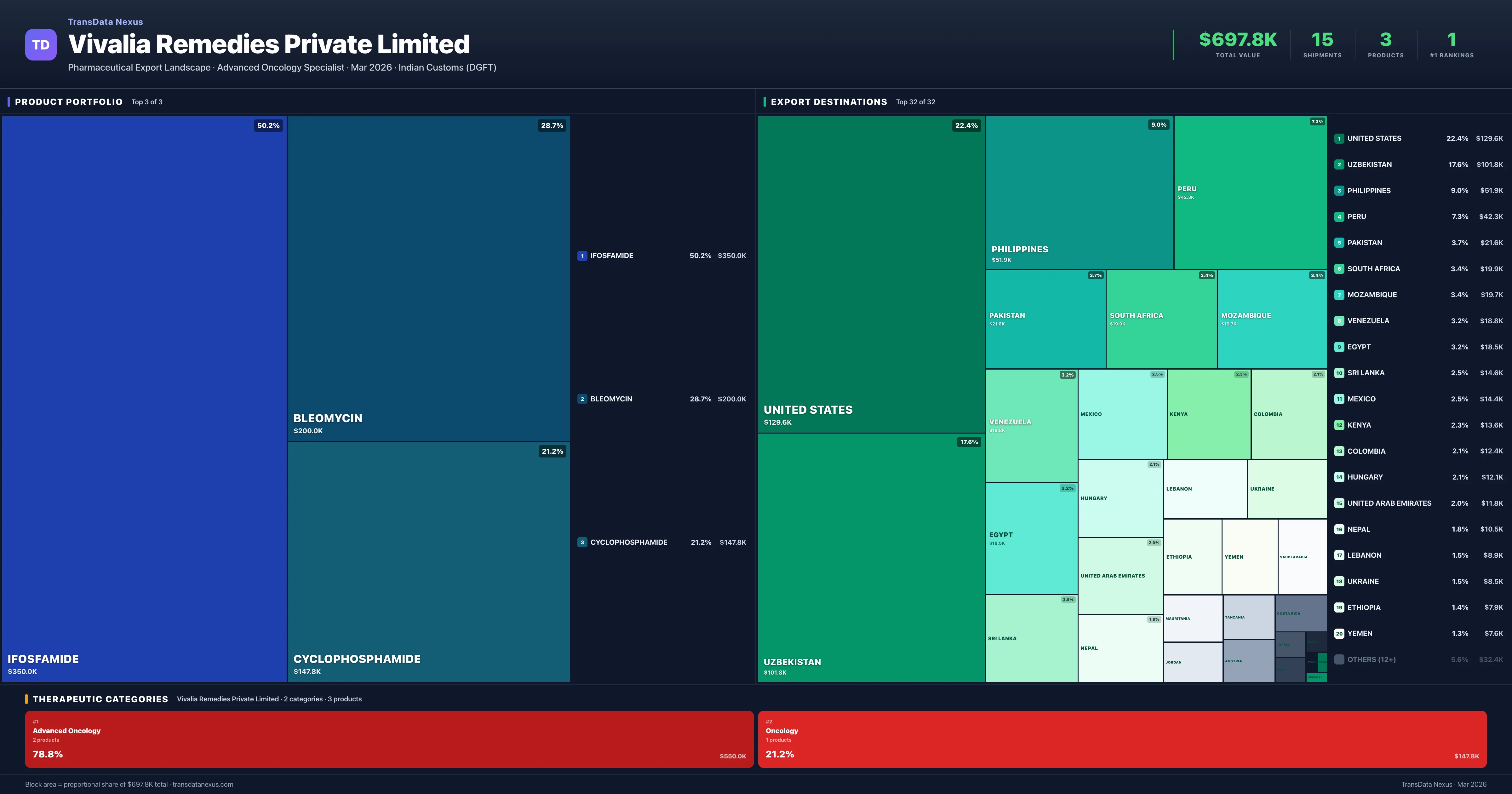 Vivalia Remedies Private Limited is an Indian pharmaceutical exporter with a total trade value of $697.8K across 3 products in 2 therapeutic categories. Based on 15 verified export shipments from Indian Customs (DGFT) records, Vivalia Remedies Private Limited is the #1 Indian exporter in 1 product including Ifosfamide. Top exports include Ifosfamide ($350.0K), Bleomycin ($200.0K), Cyclophosphamide ($147.8K).