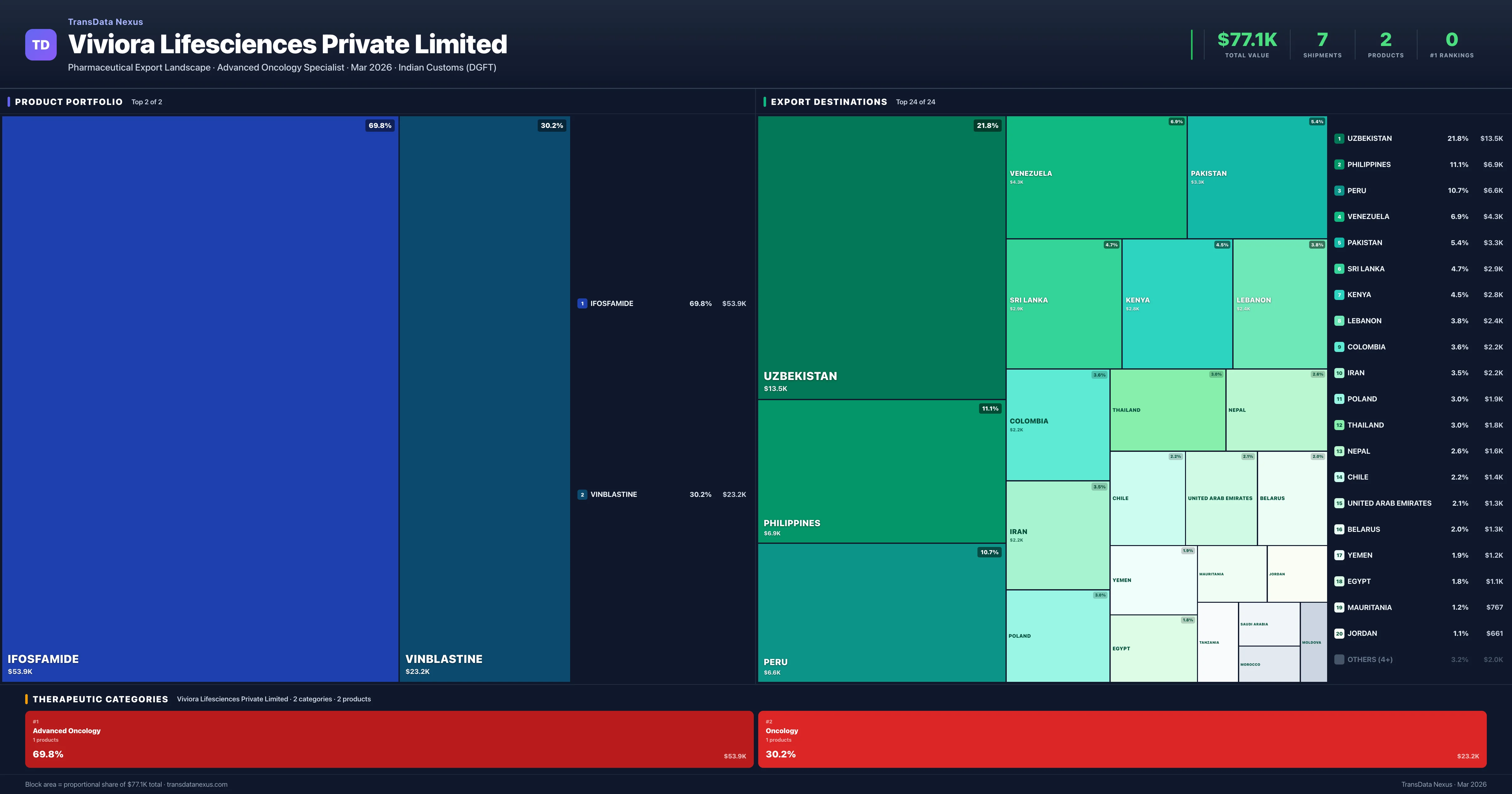 Viviora Lifesciences Private Limited exports 2 pharmaceutical products across 2 therapeutic categories. The top exports are Ifosfamide ($53.9K), Vinblastine ($23.2K). Total export value is $77.1K.