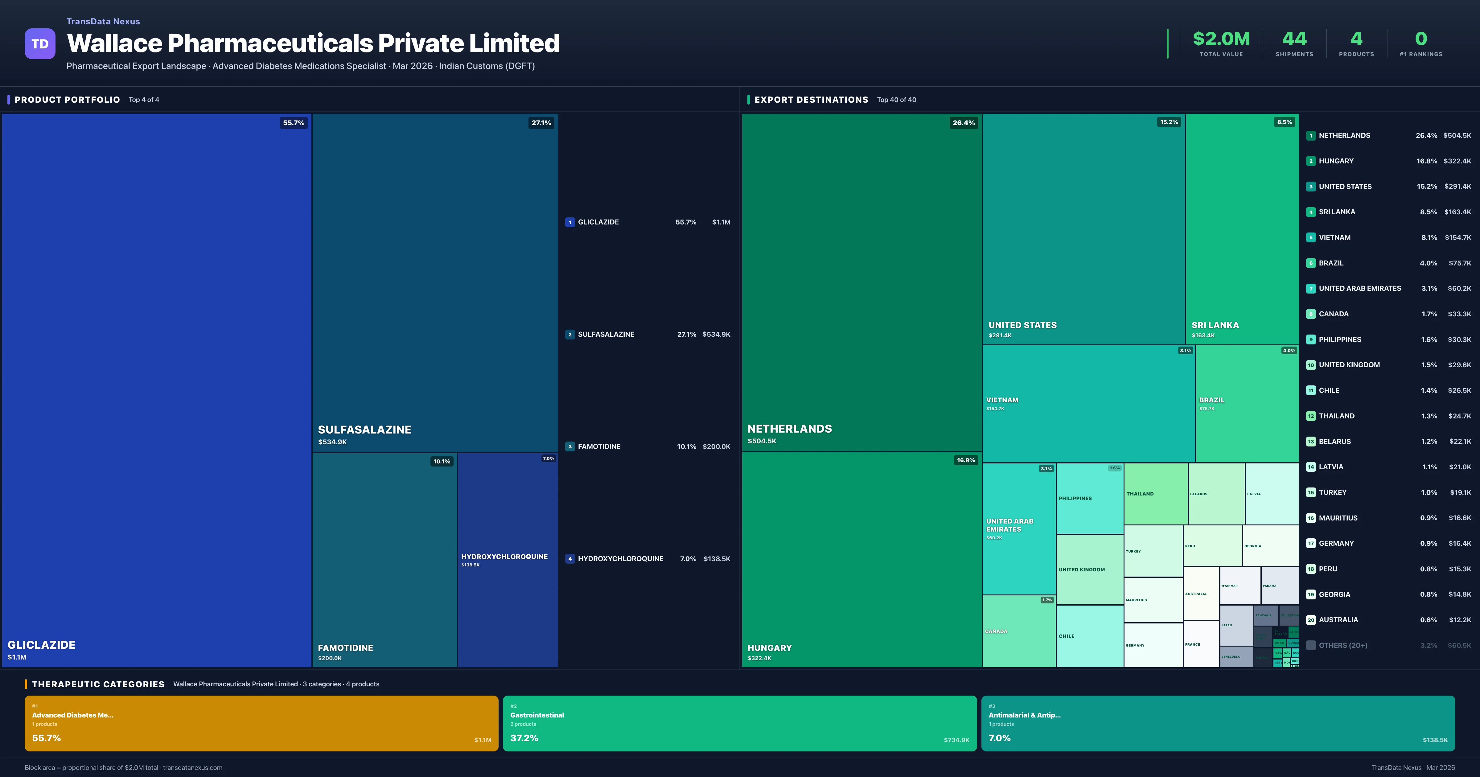 Wallace Pharmaceuticals Private Limited is an Indian pharmaceutical exporter with a total trade value of $2.0M across 4 products in 3 therapeutic categories. Based on 44 verified export shipments from Indian Customs (DGFT) records, the company actively competes across multiple product segments. Top exports include Gliclazide ($1.1M), Sulfasalazine ($534.9K), Famotidine ($200.0K).