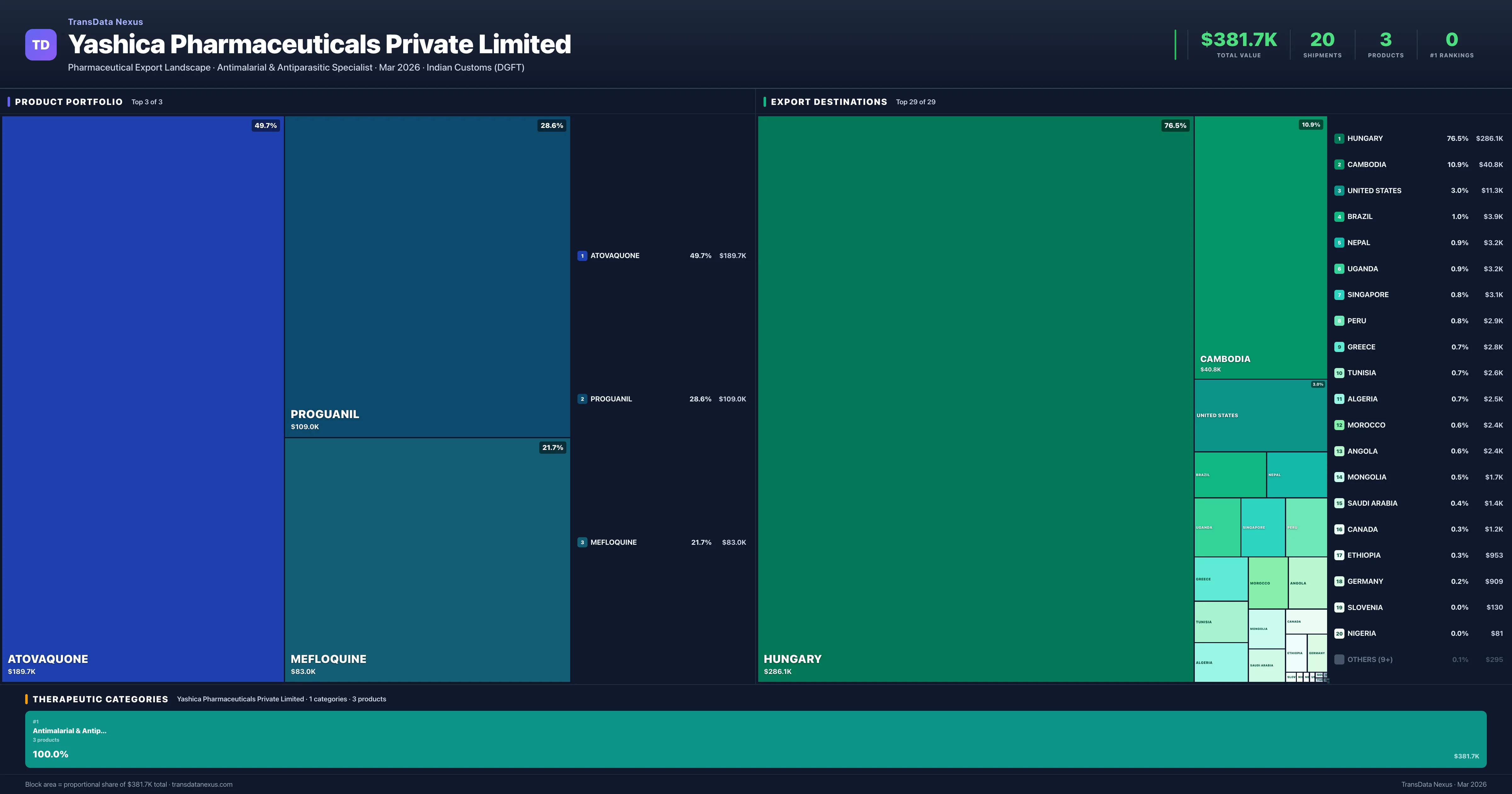 Yashica Pharmaceuticals Private Limited โ Export Portfolio & Destination Treemap