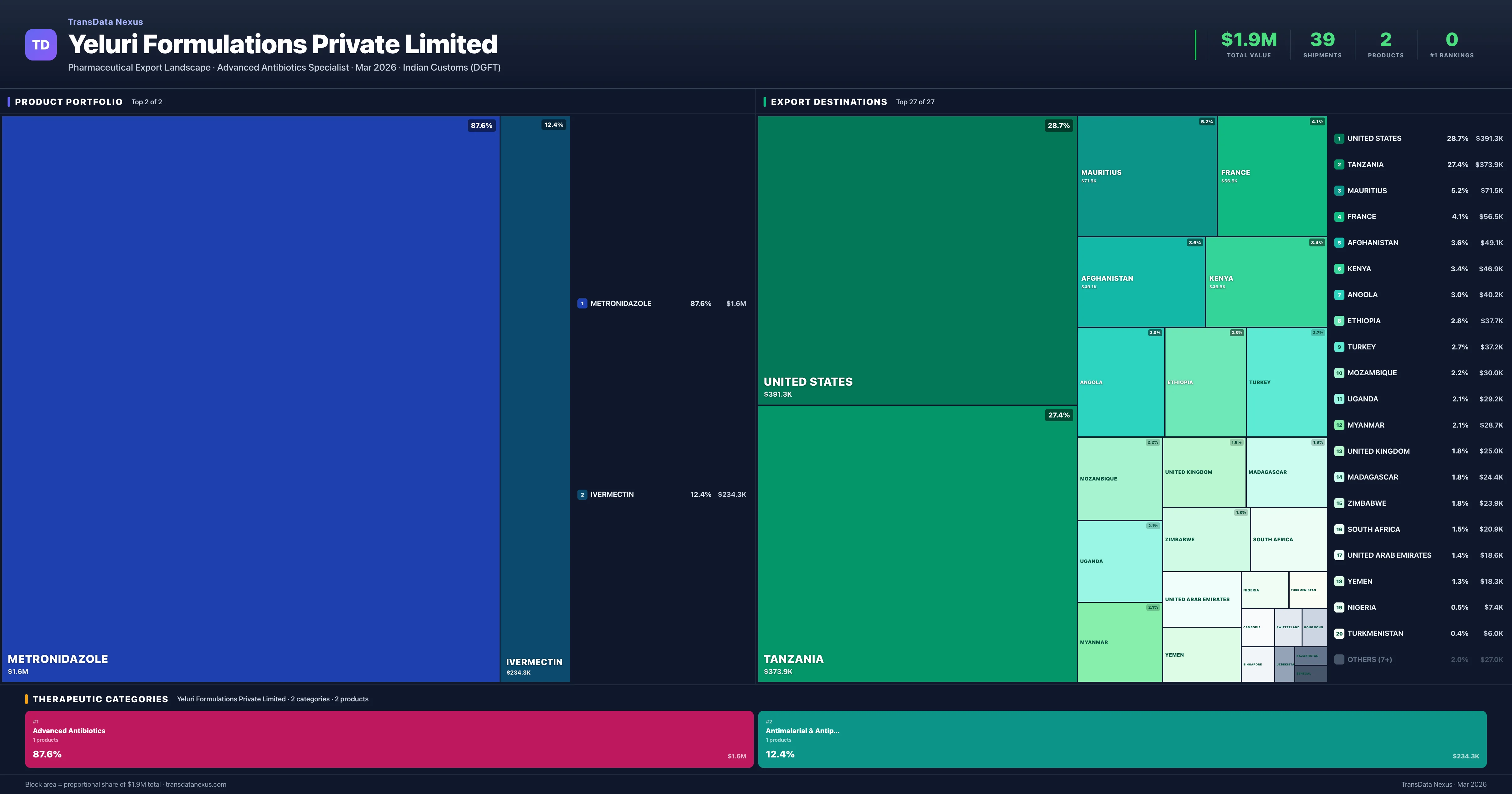 Yeluri Formulations Private Limited is an Indian pharmaceutical exporter with a total trade value of $1.9M across 2 products in 2 therapeutic categories. Based on 39 verified export shipments from Indian Customs (DGFT) records, the company actively competes across multiple product segments. Top exports include Metronidazole ($1.6M), Ivermectin ($234.3K), .