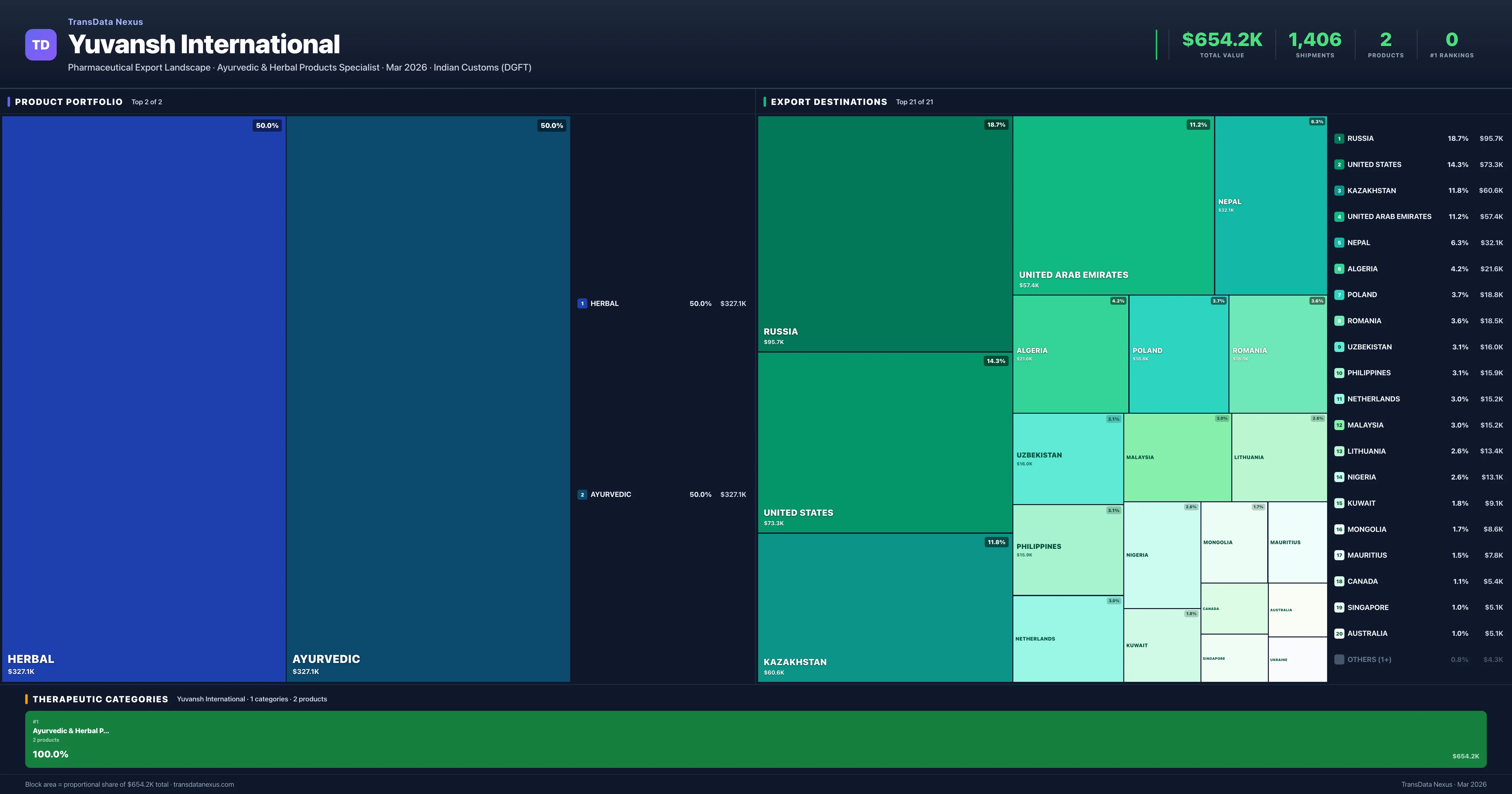 Yuvansh International exports 2 pharmaceutical products across 1 therapeutic categories. The top exports are Herbal ($327.1K), Ayurvedic ($327.1K). Total export value is $654.2K.