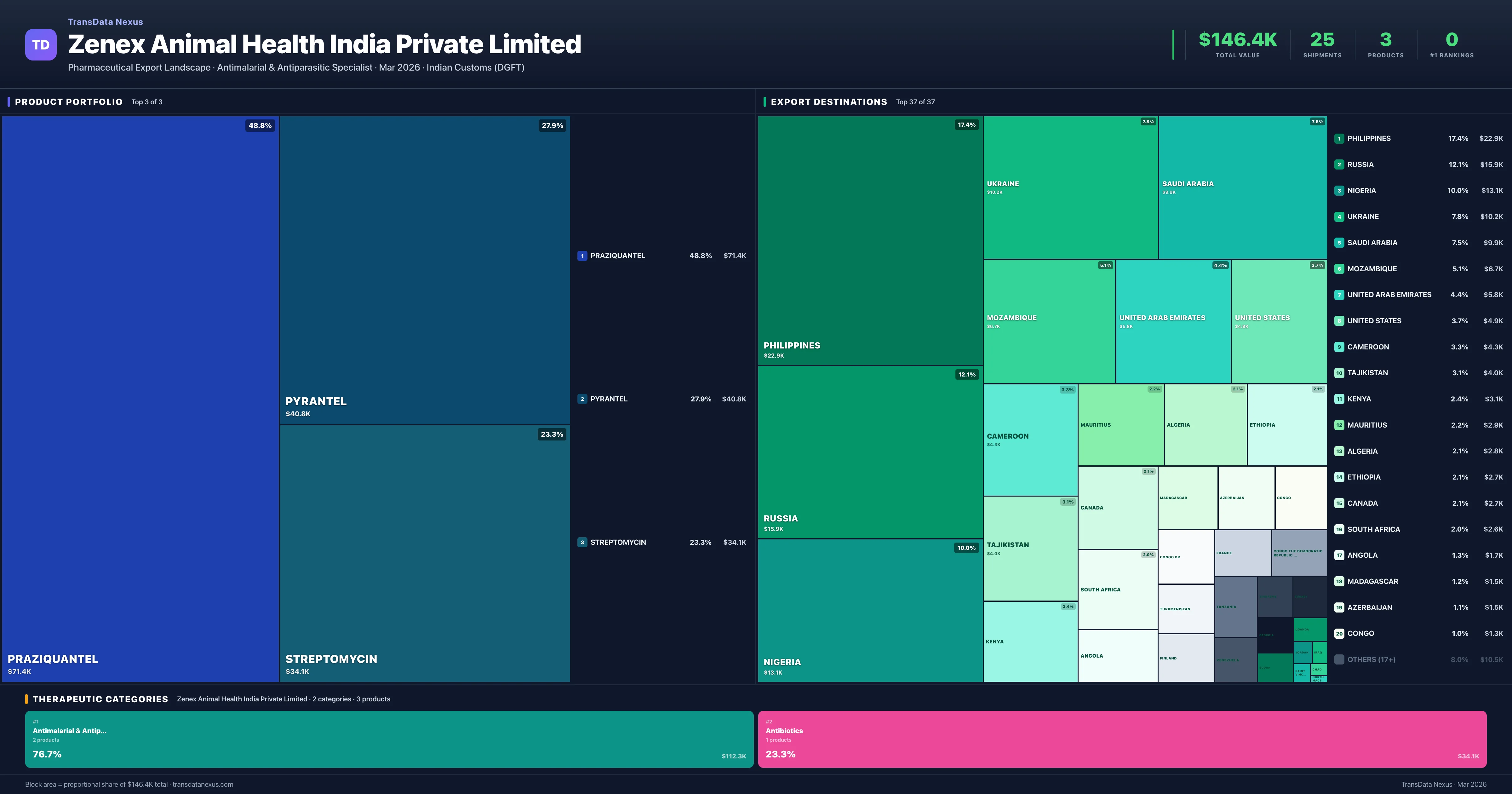 Zenex Animal Health India Private Limited exports 3 pharmaceutical products across 2 therapeutic categories. The top exports are Praziquantel ($71.4K), Pyrantel ($40.8K), Streptomycin ($34.1K). Total export value is $146.4K.