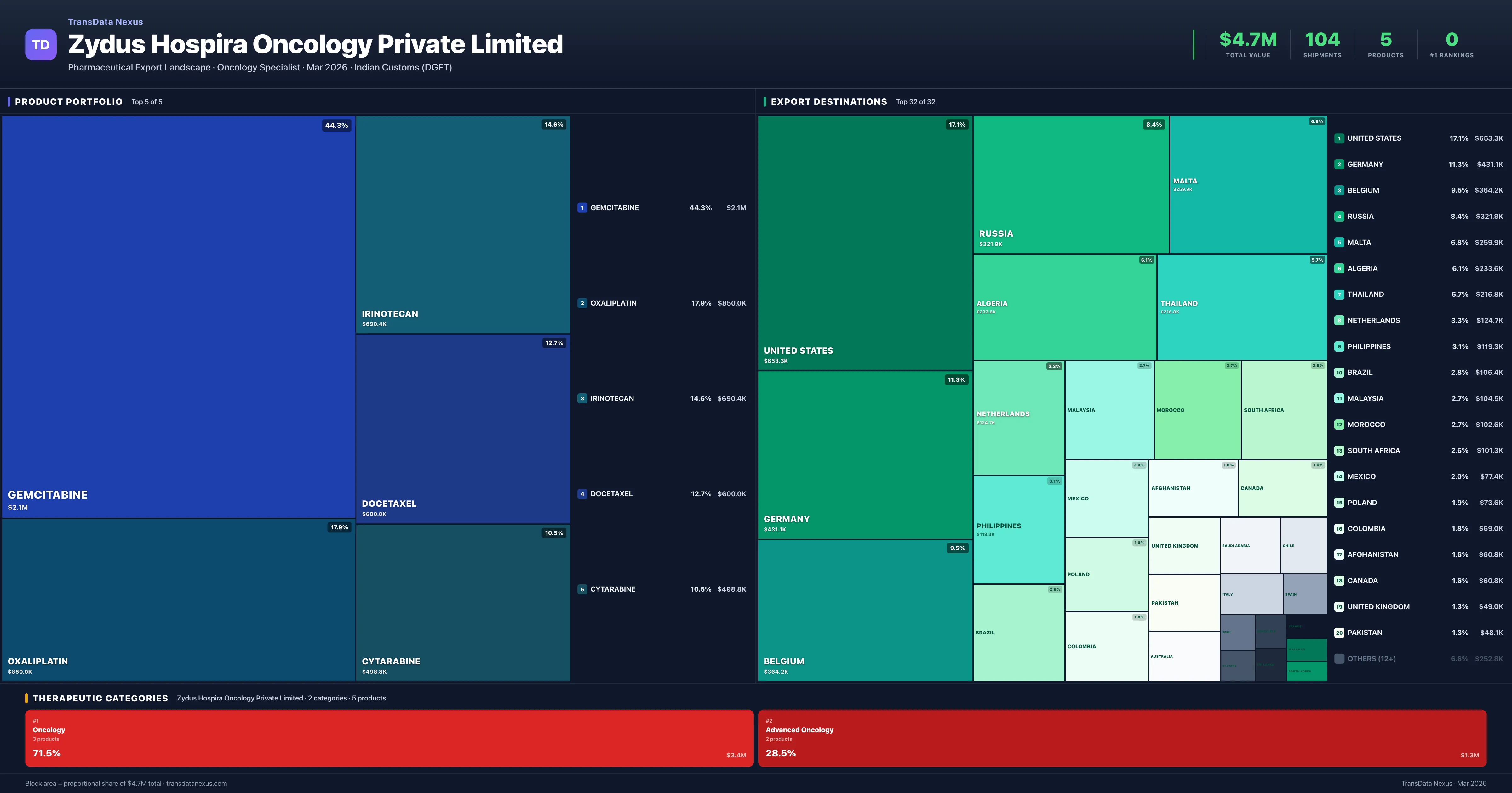 Zydus Hospira Oncology Private Limited's total pharmaceutical export value is $4.7M, based on 104 verified shipments recorded in Indian Customs (DGFT) data.