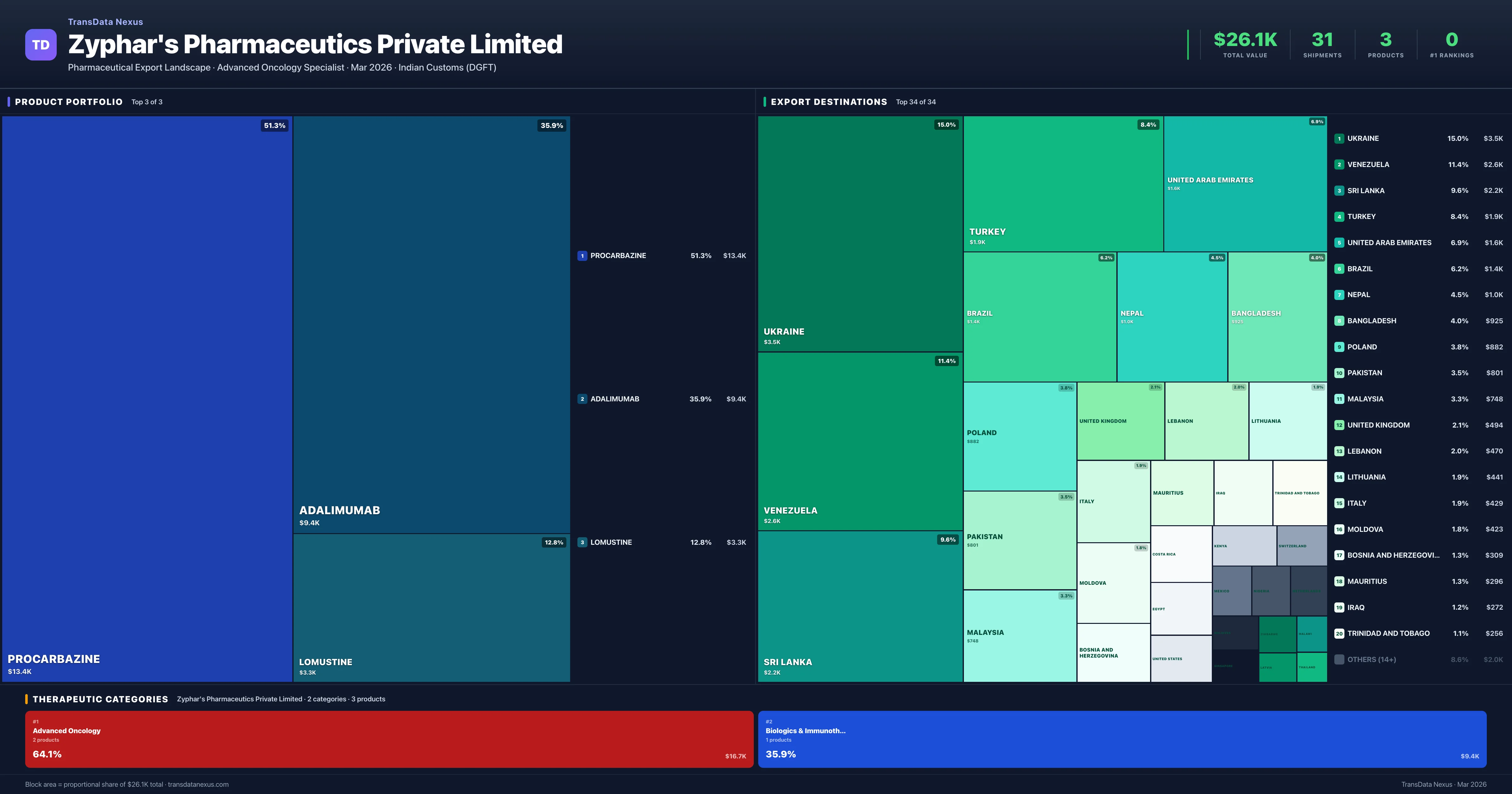 Zyphar's Pharmaceutics specializes in the manufacturing of finished pharmaceutical formulations, including tablets, capsules, syrups, and injections. The company's product portfolio is concentrated in two therapeutic categories: Advanced Oncology (64.1%) and Biologics & Immunotherapy (35.9%). The top three exported products are Procarbazine ($13K, Rank #5, 3.5% market share), Adalimumab ($9K, Rank #8, 0.8% market share), and Lomustine ($3K, Rank #7, 3.2% market share). The total export value amounts to $26K USD across 31 shipments, indicating a focused export strategy.